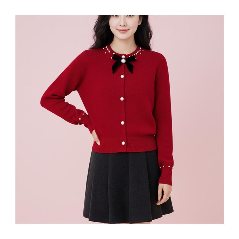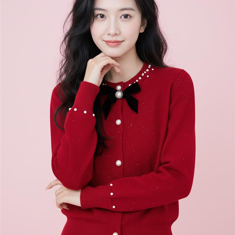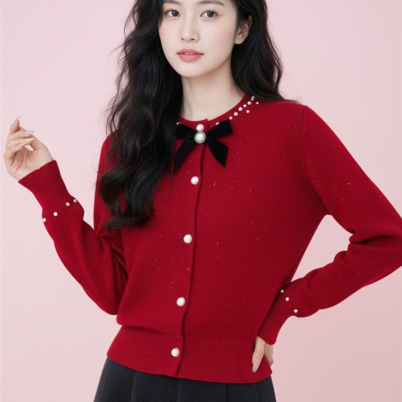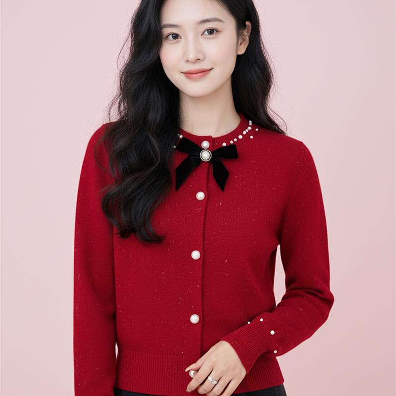 法式红色短款开衫毛衣外套女2025秋季高级感甜美休闲针织衫上衣