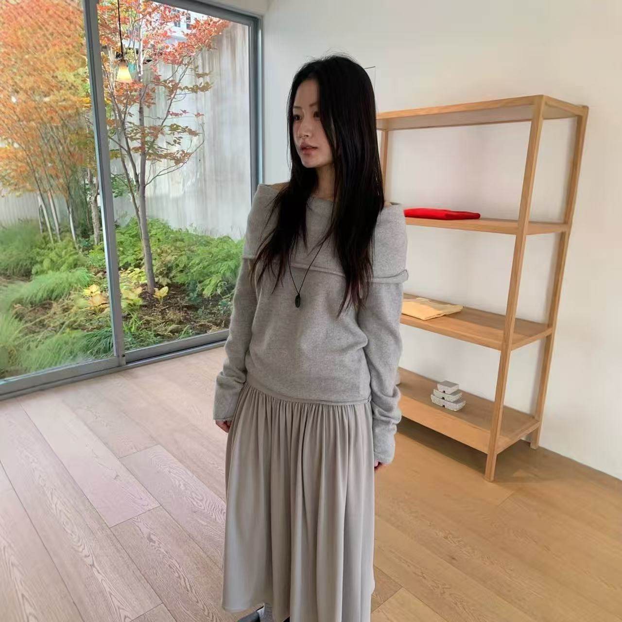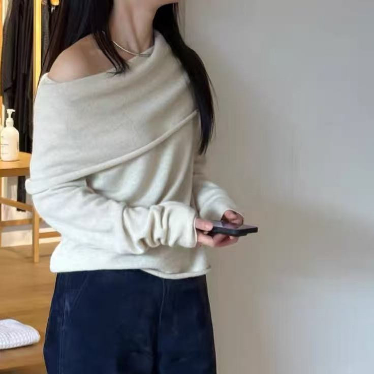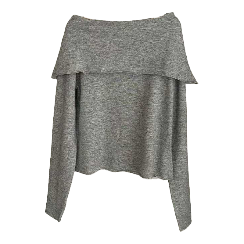露肩上衣 染色工艺设计师Mo*ha美利奴羊毛一字肩斜肩针织衫