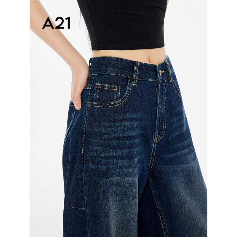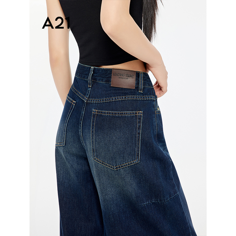 A21女装深蓝无弹宽松阔腿牛仔裤