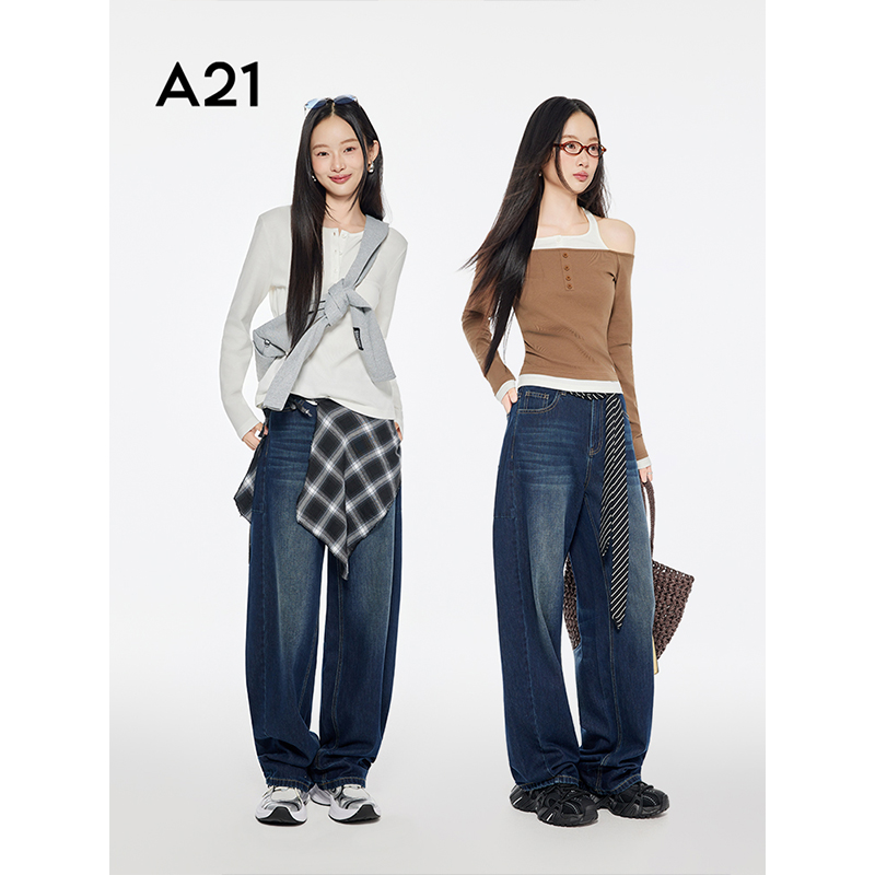 A21女装无弹牛仔裤2025秋新款简约宽松长裤高腰阔腿裤F453226006
