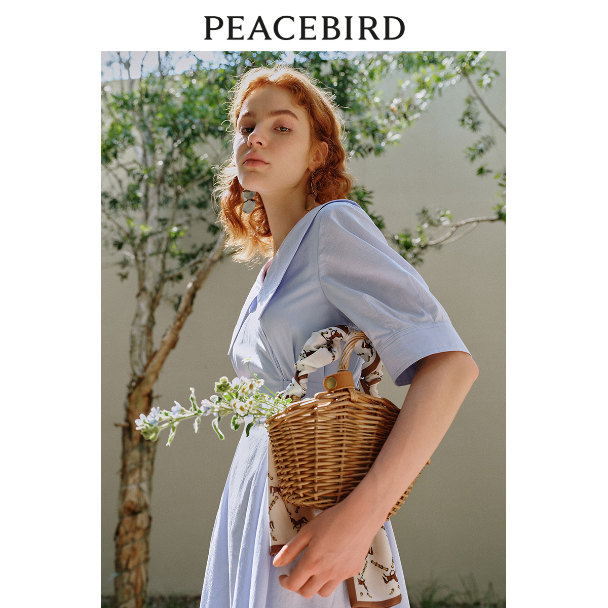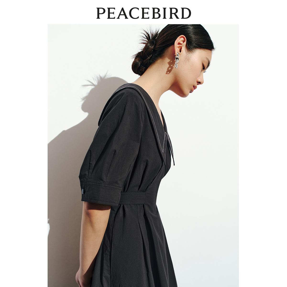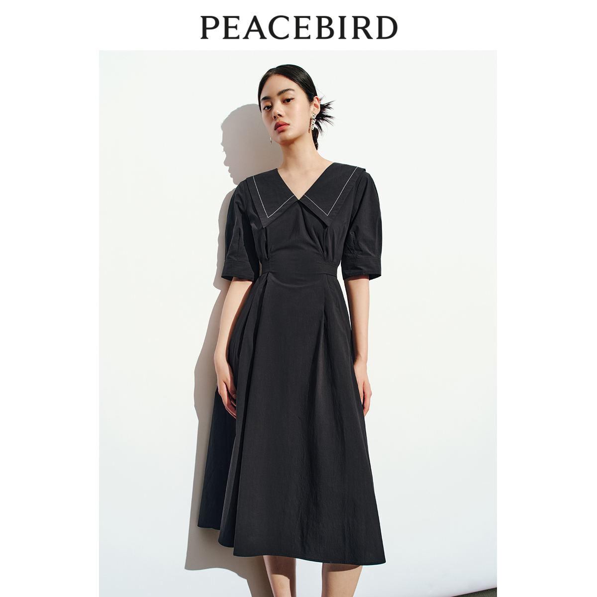 太平鸟 2023年夏季大翻领连衣裙法式V领收腰显瘦长裙女士