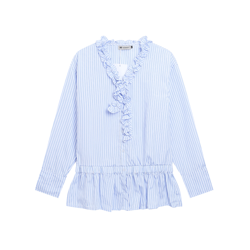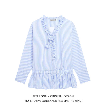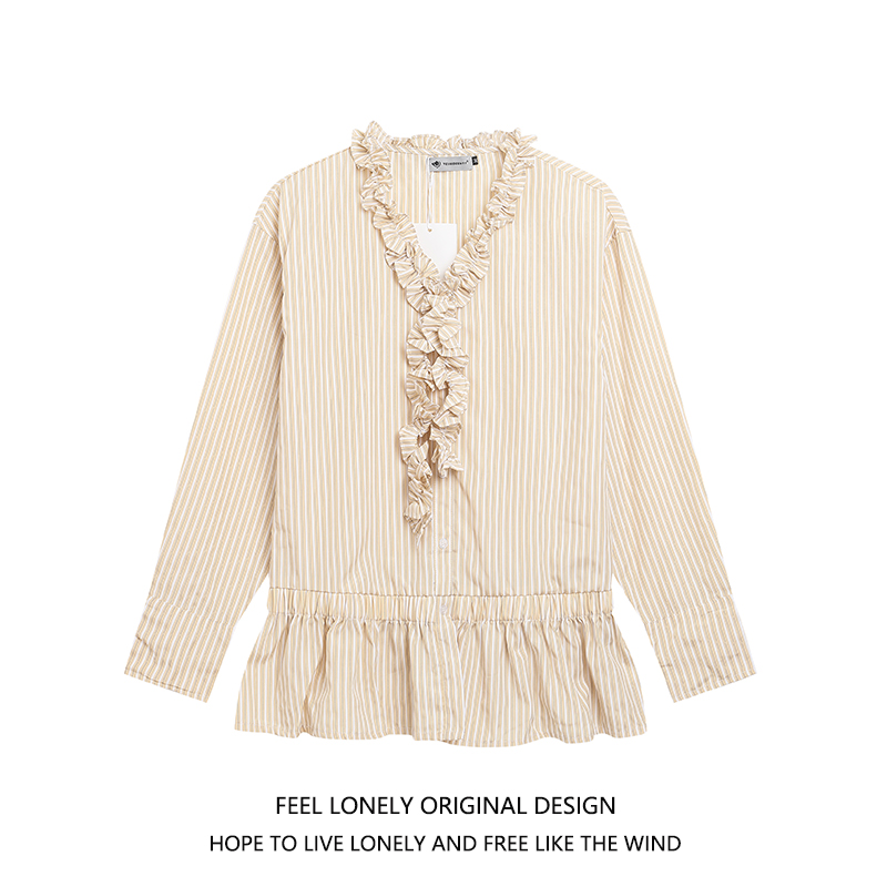 Feel lonely法式别致木耳边V领长袖衬衫女秋季中长款收腰条纹衬衫
