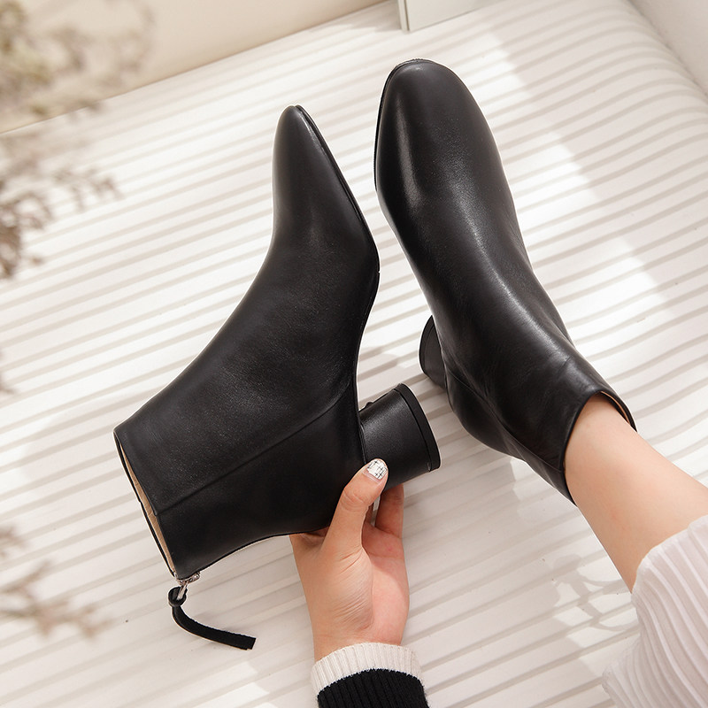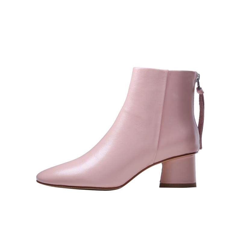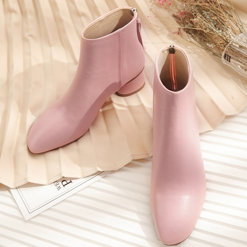 粉色短靴女春秋单靴方头中跟粗跟5厘米百搭米白色马丁靴初秋时尚