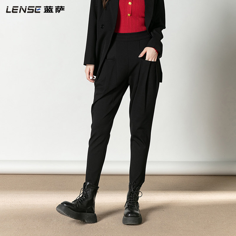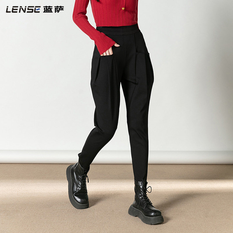蓝萨2025春秋季新款叠兜高腰哈伦裤女小脚时尚黑色显瘦大码休闲裤
