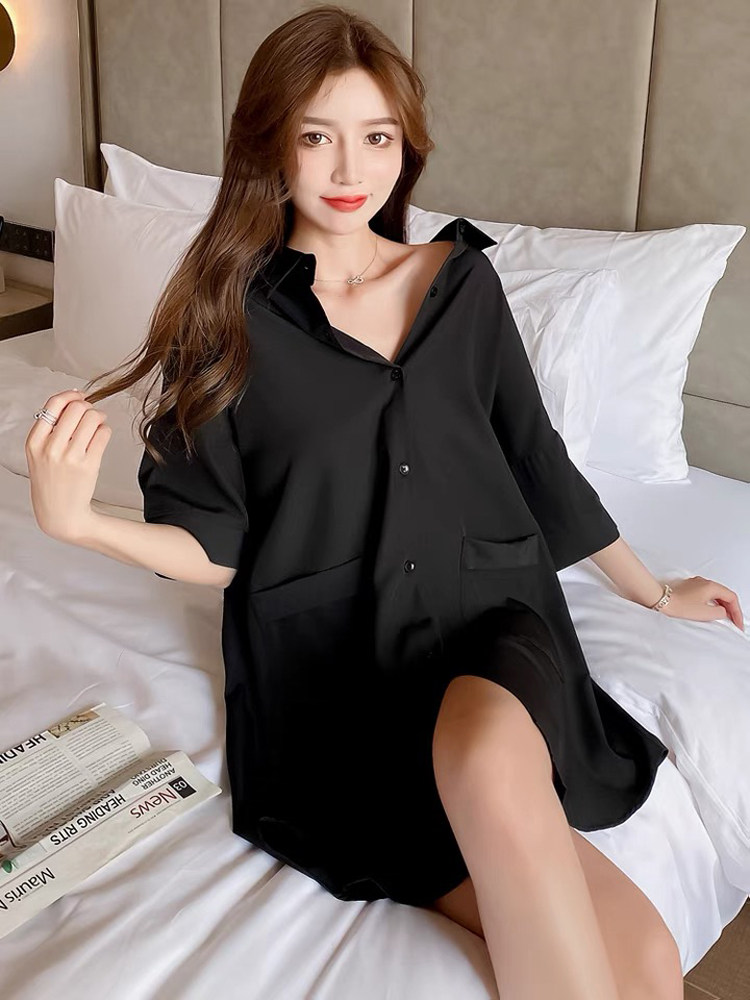 私房睡裙女夏季雪纺薄款中袖小性感蕾丝露背白衬衫春秋中长款睡衣
