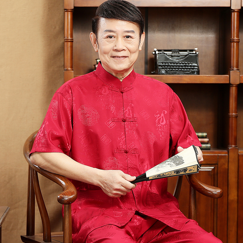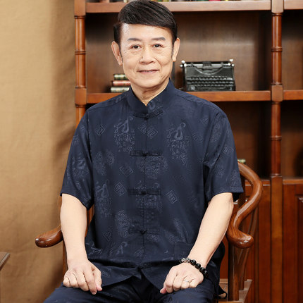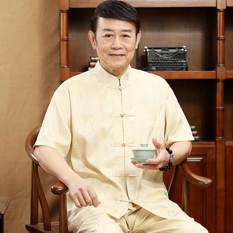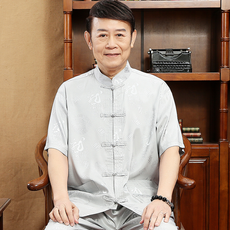 夏季丝质唐装男短袖套装中国风中式盘扣爸爸装中老年人立领太极服