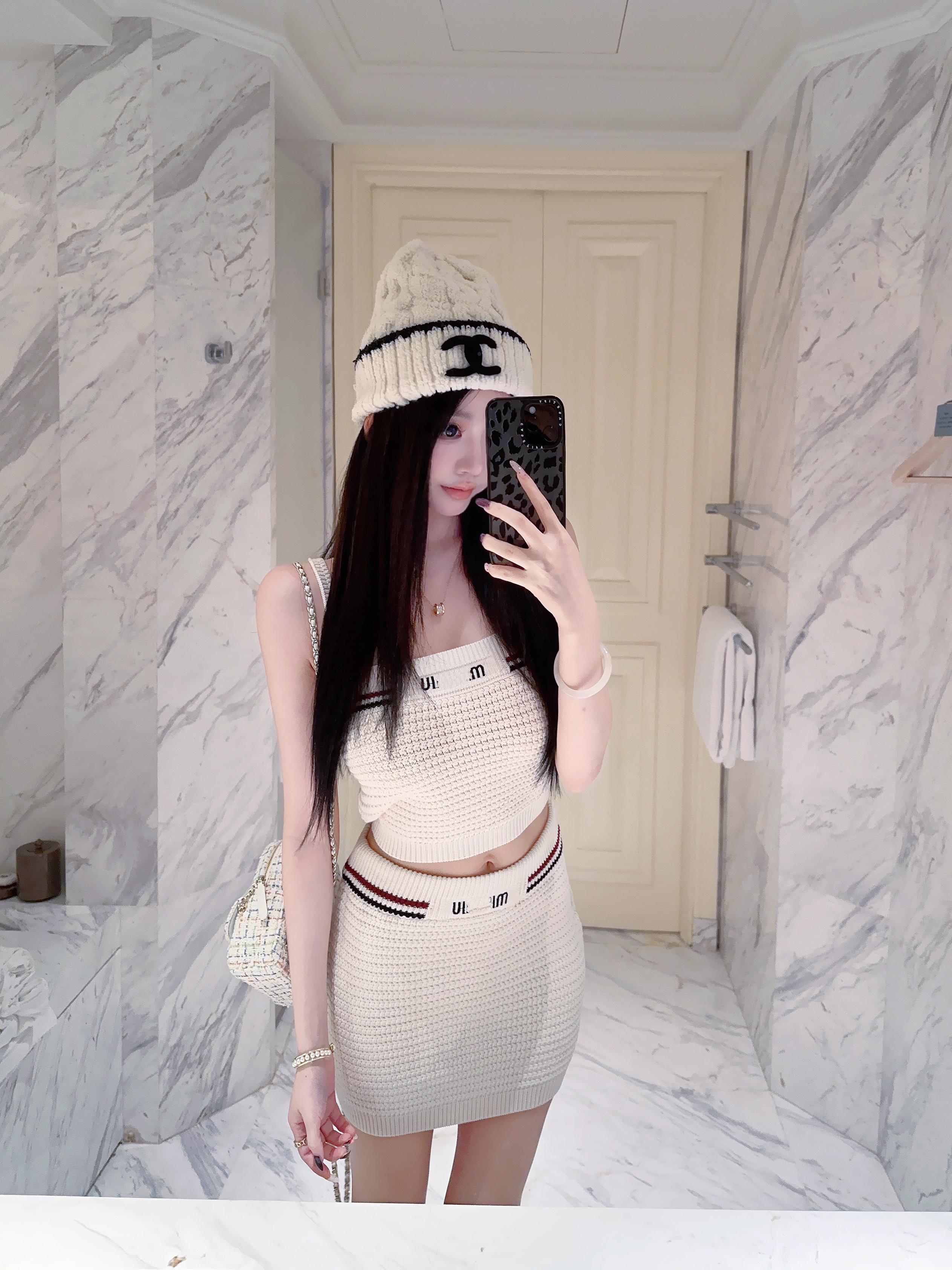 Eva君君酱miu系刺绣拼色纯欲华夫格针织吊带背心半身裙减龄套装女