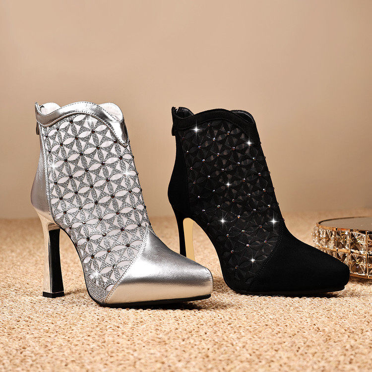 春秋夏靴皮靴细高跟短靴女镂空网靴凉靴单靴银色靴子真皮女靴 XZJ
