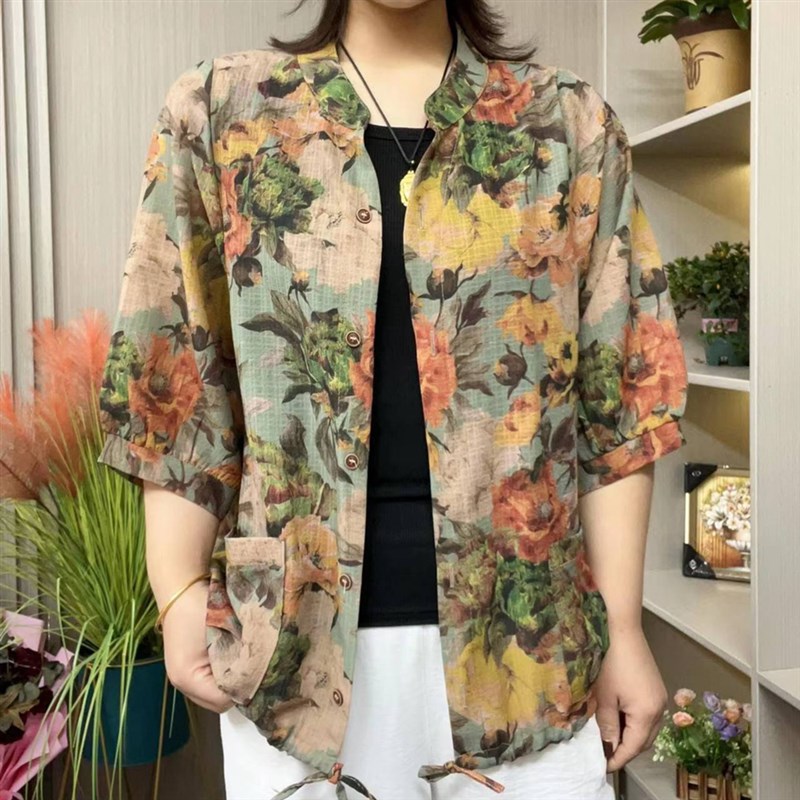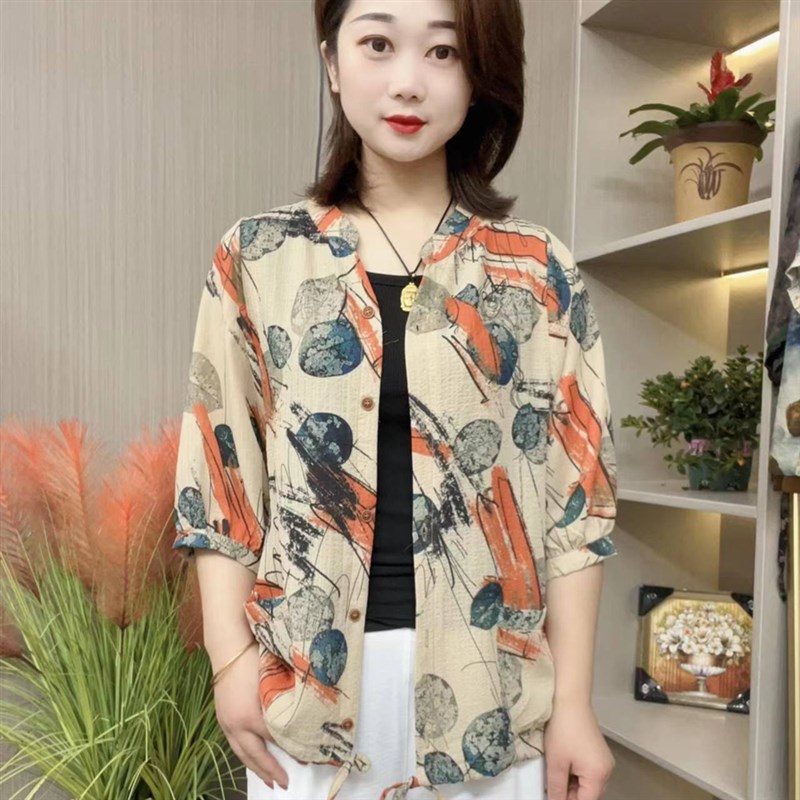 轻薄开衫上衣外套女2024夏季新款时尚洋气大花七分灯笼袖防晒衬衫