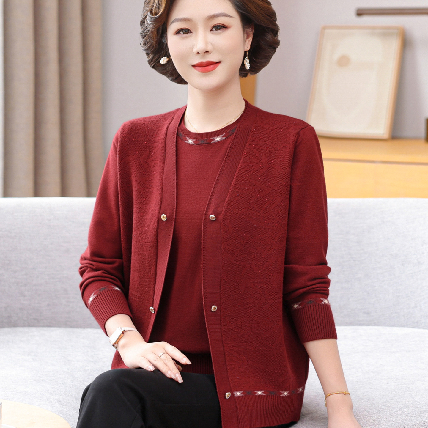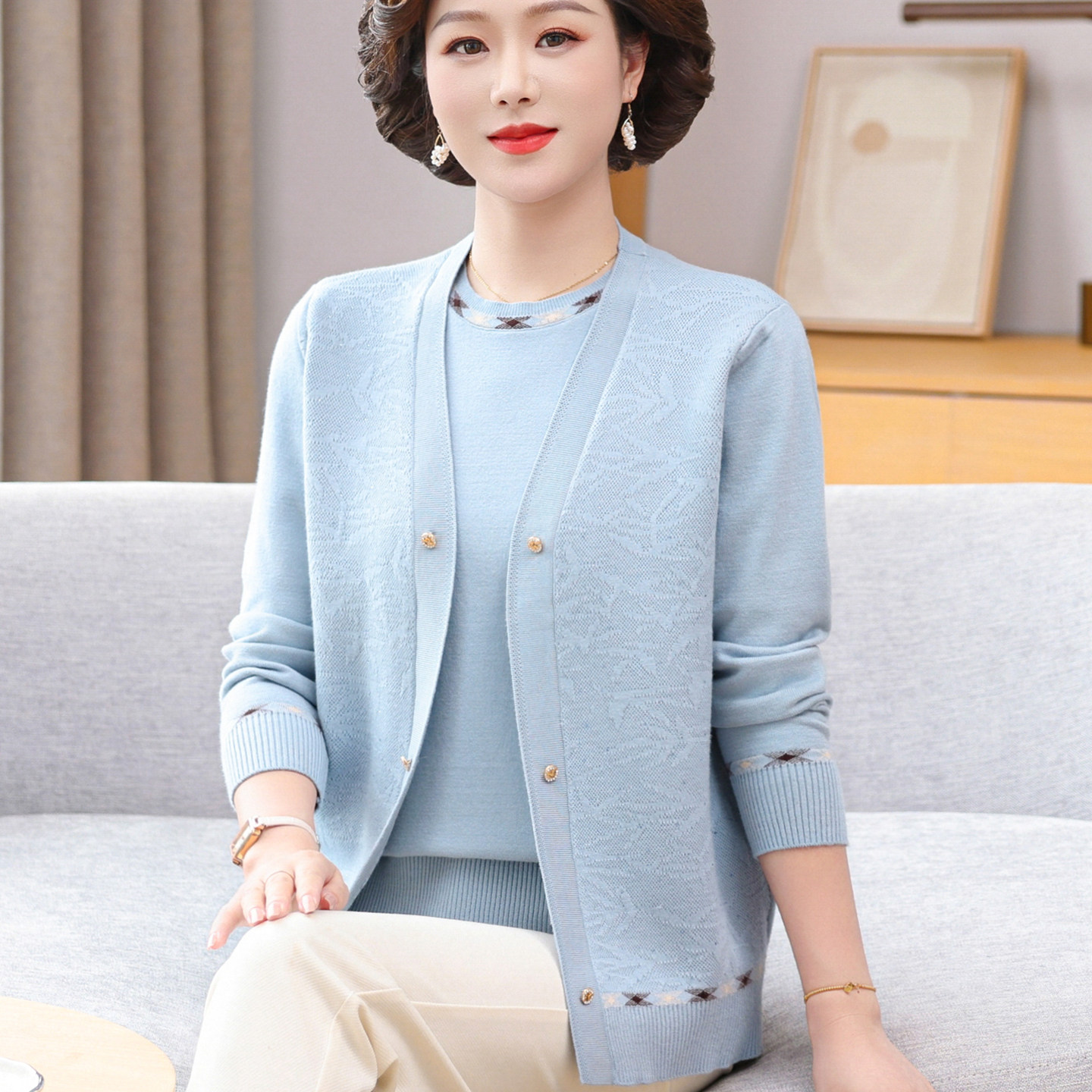 妈妈秋装套装针织洋气小衫中年女薄款开衫外套中老年夏季短款上衣