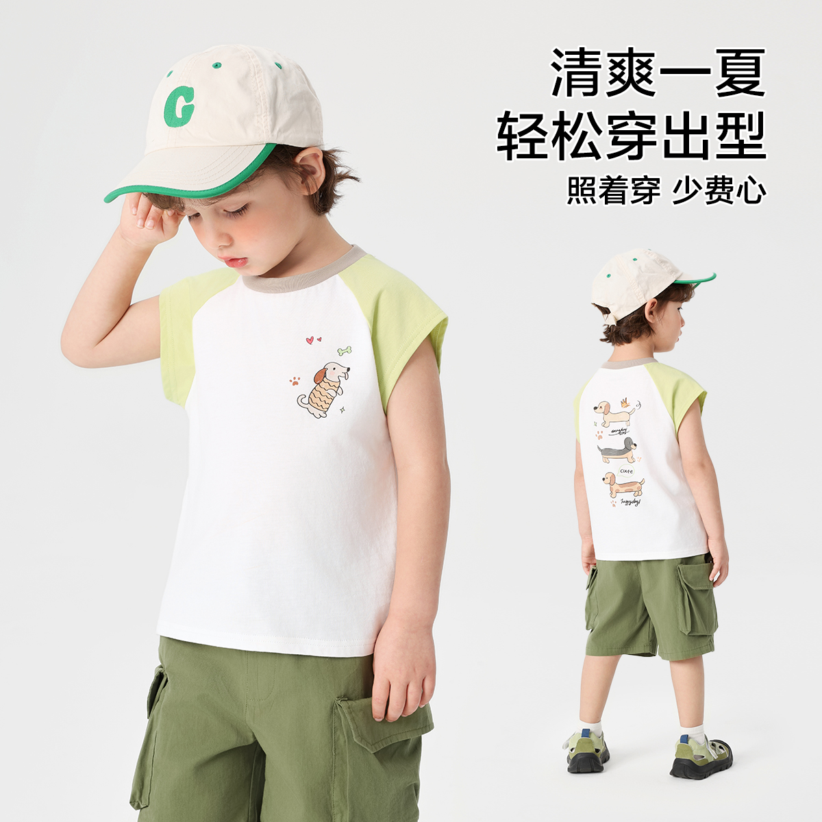 右欧男童背心纯棉腊肠小狗卡通夏季新款童装休闲女童儿童无袖T恤