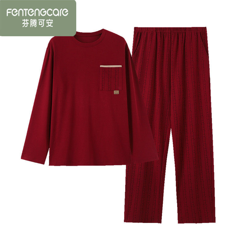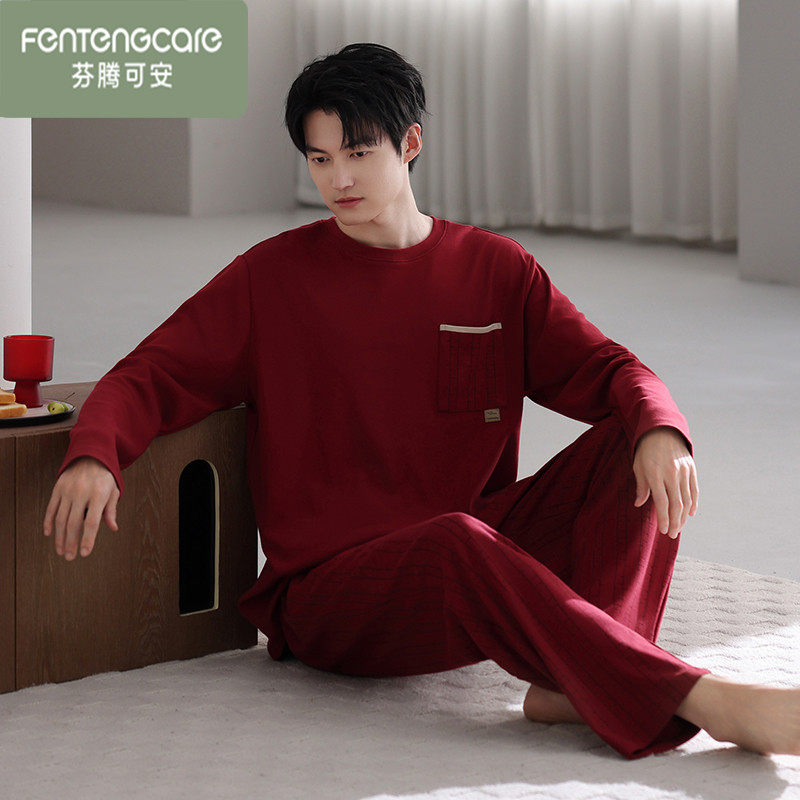 芬腾可安男士睡衣本命年红色纯棉长袖春秋季男款全棉可外穿家居服