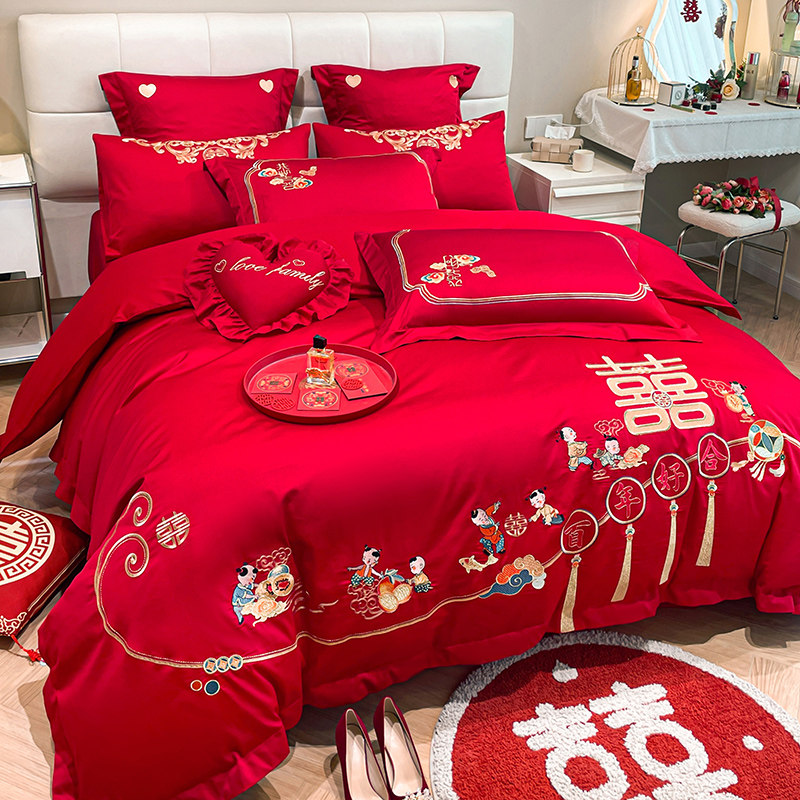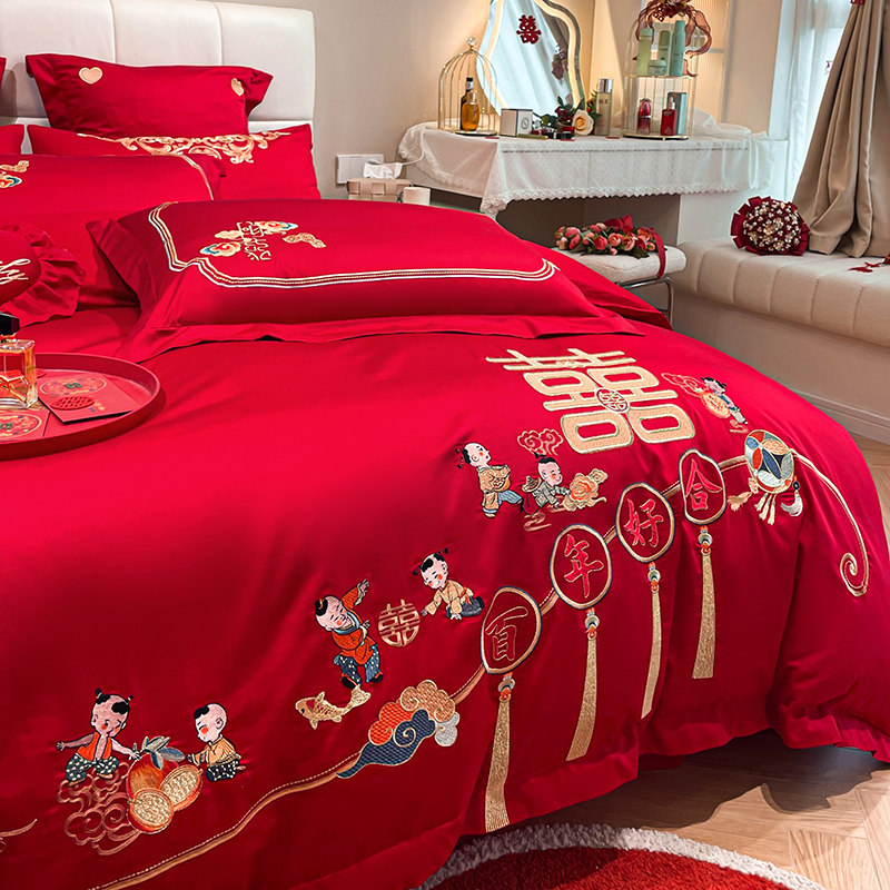 新中式婚庆四件套大红色全棉百子图床单结婚床上用品喜被