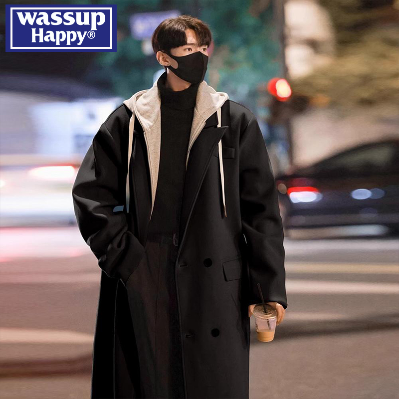 wassup happy中长款毛呢大衣男秋冬季潮牌假两件连帽过膝风衣外套