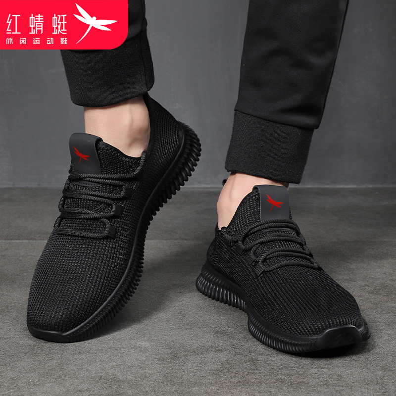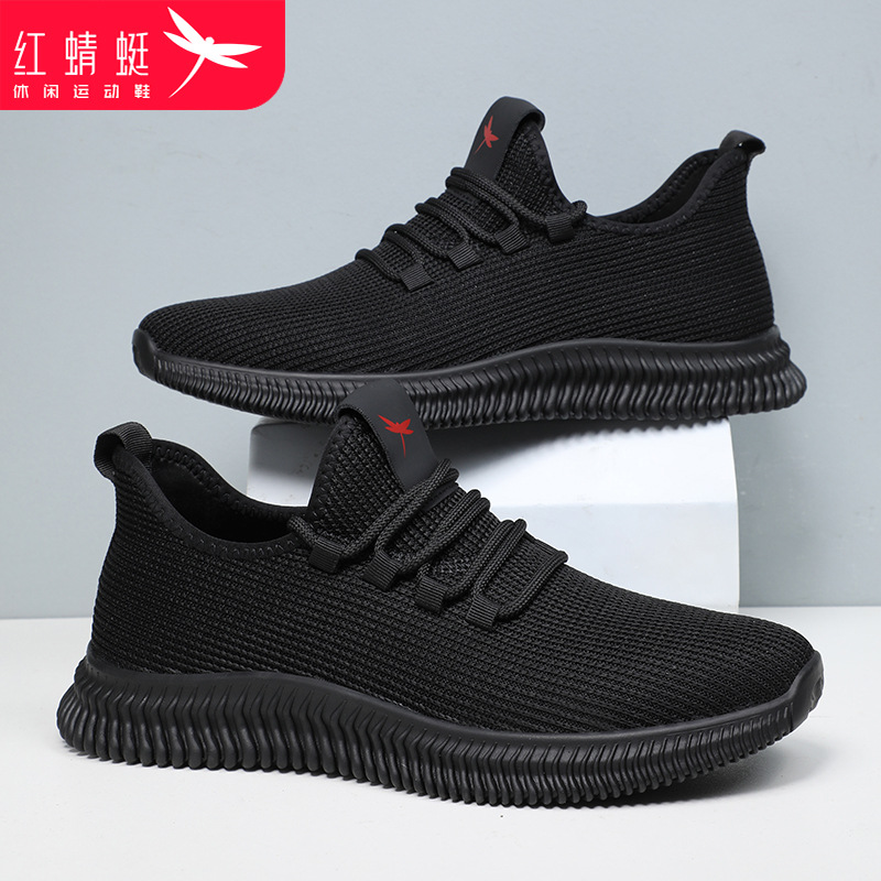 红蜻蜓男鞋夏季运动休闲鞋男飞织黑色软底跑步鞋子透气防臭旅游鞋