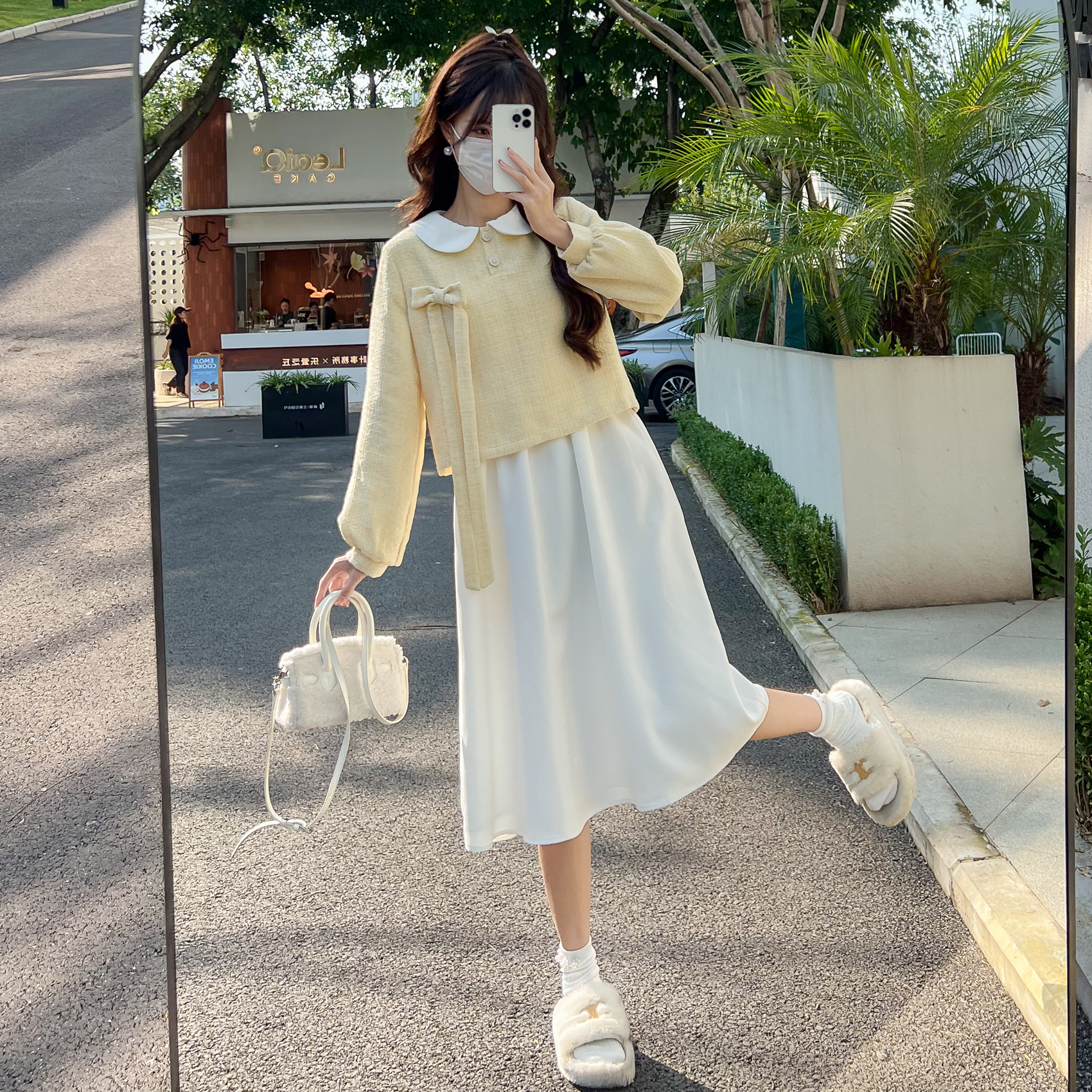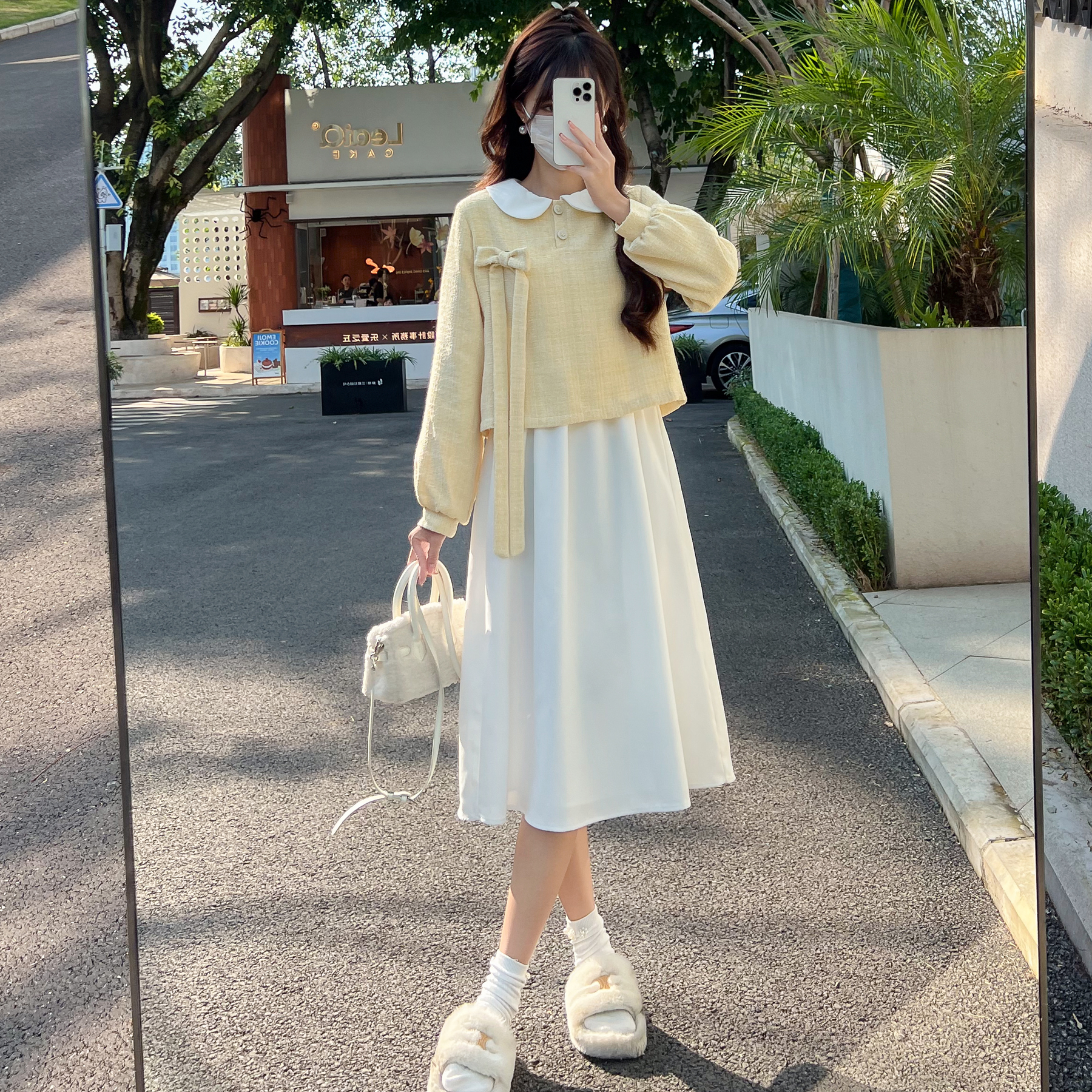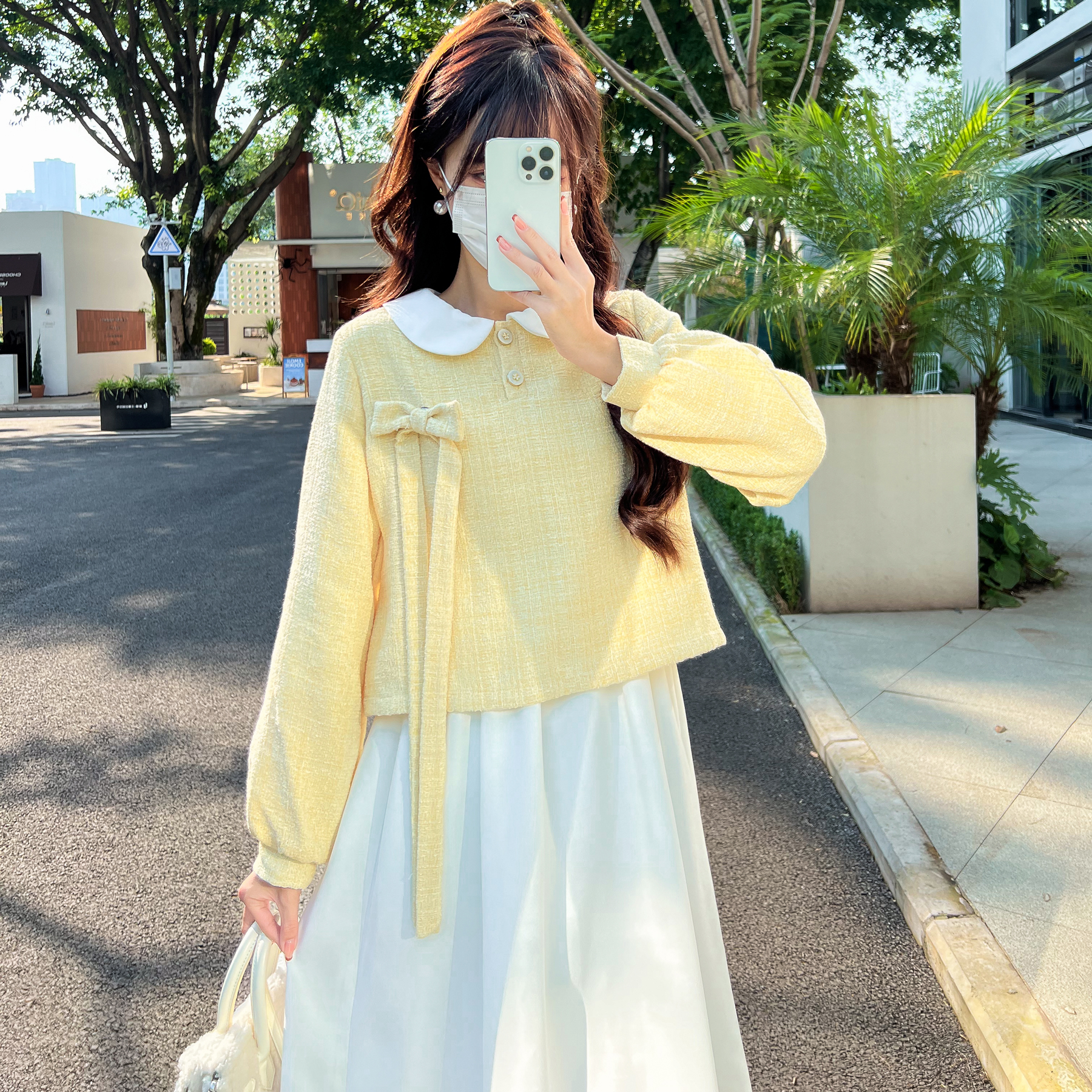 花崎鹿法式气质小香风鹅黄色假两件长裙白檀香氛连衣裙减龄小个子