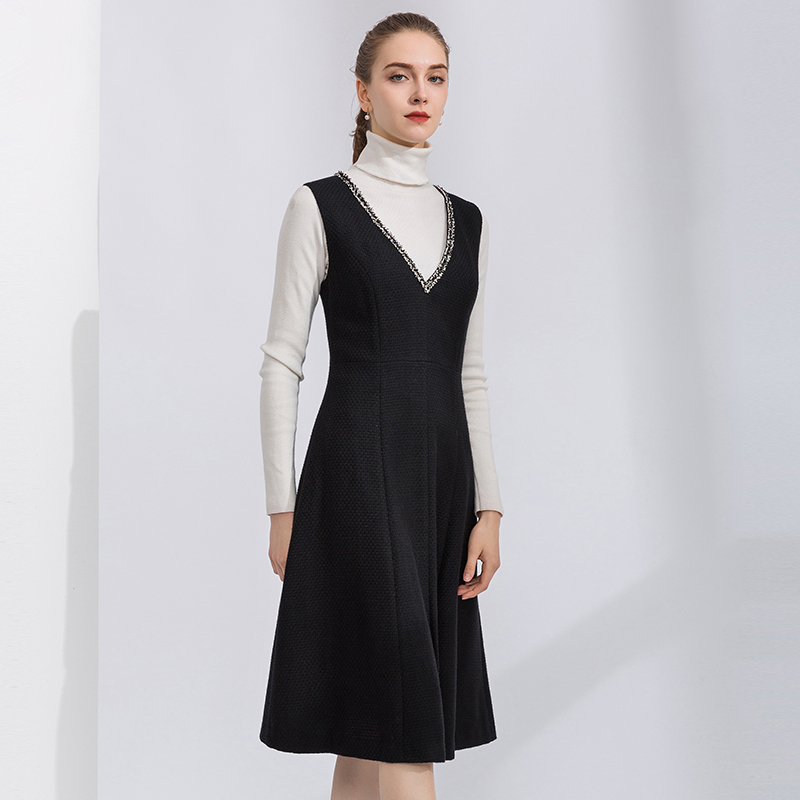 名师路女装新款秋装黑色大V领收腰背心修身显瘦连衣裙中长裙