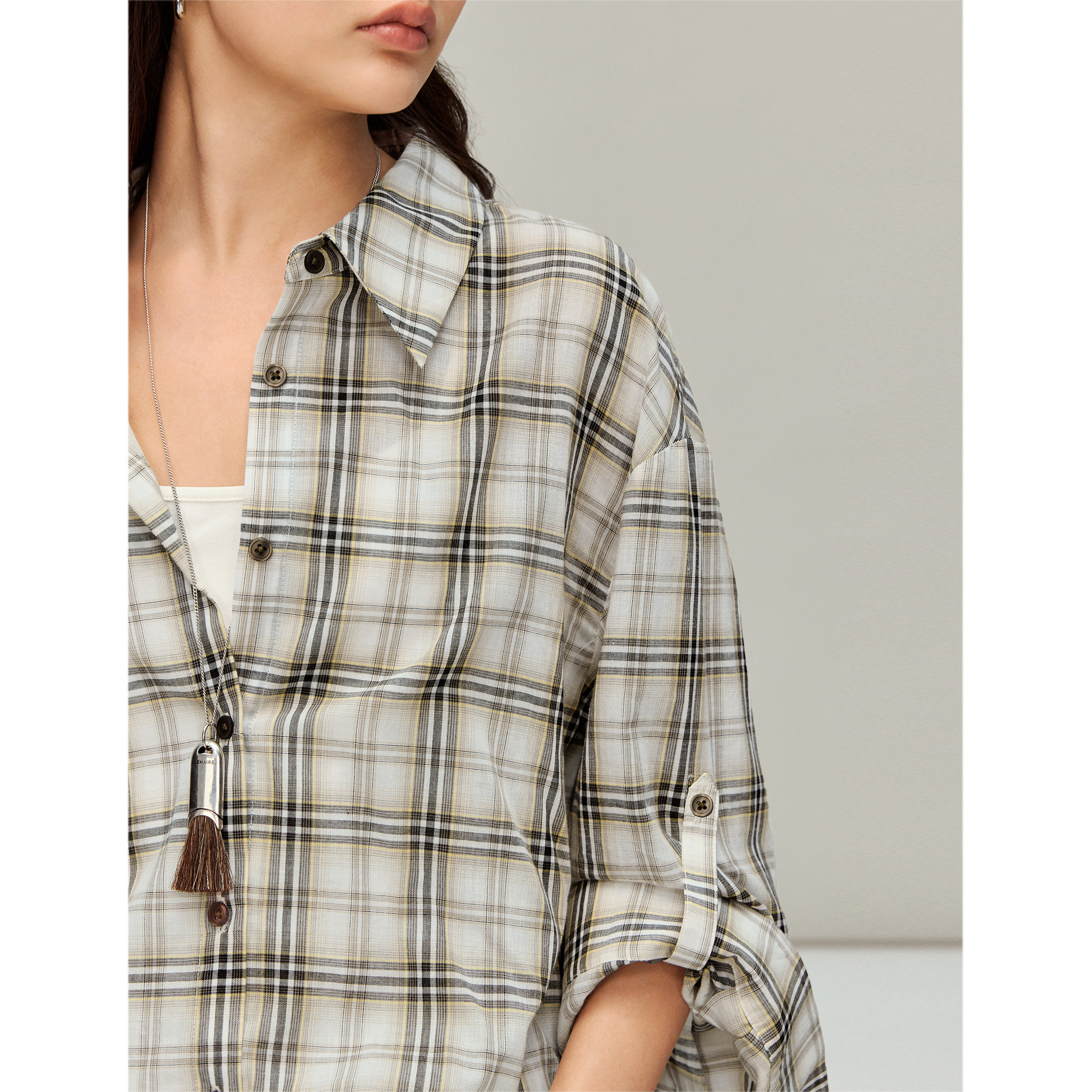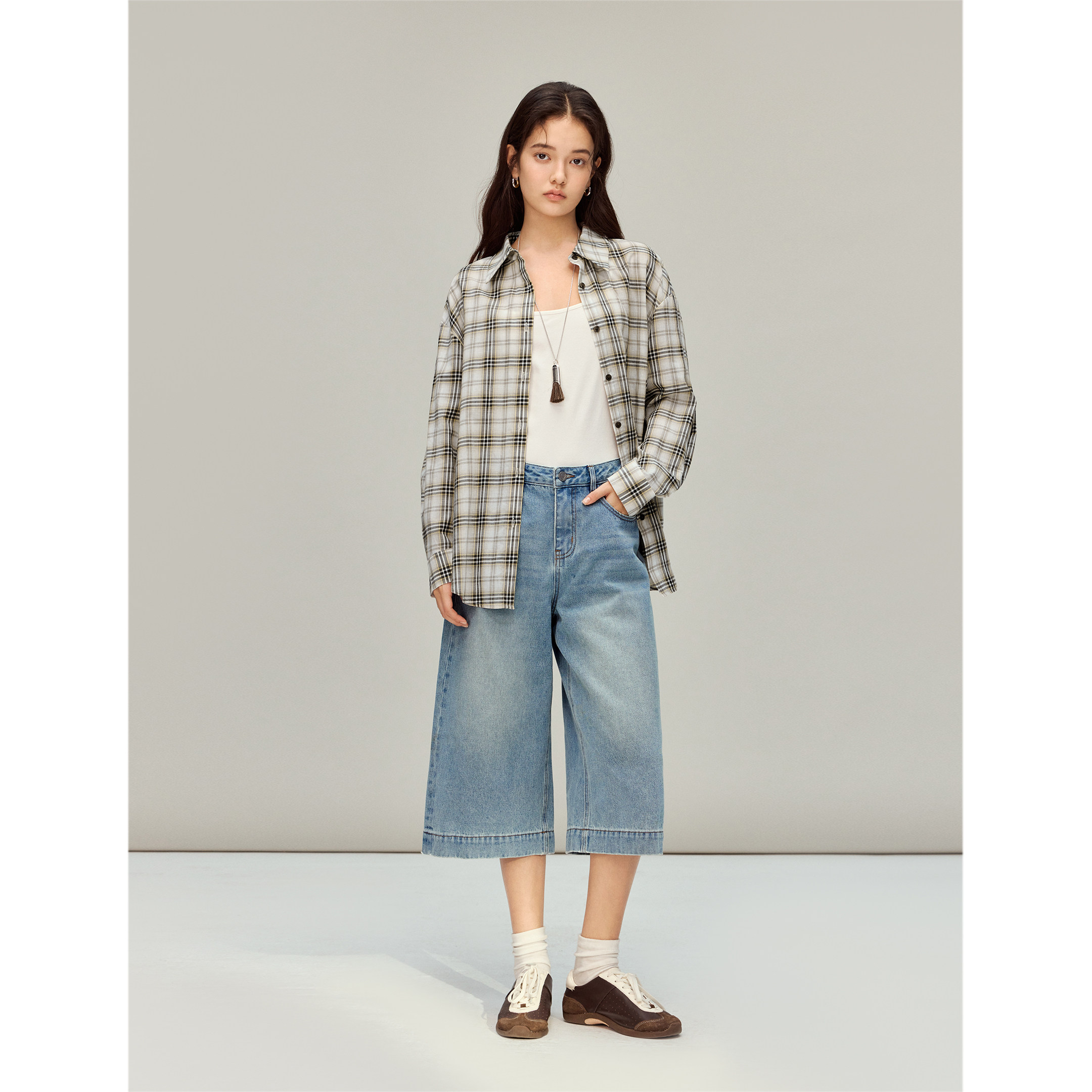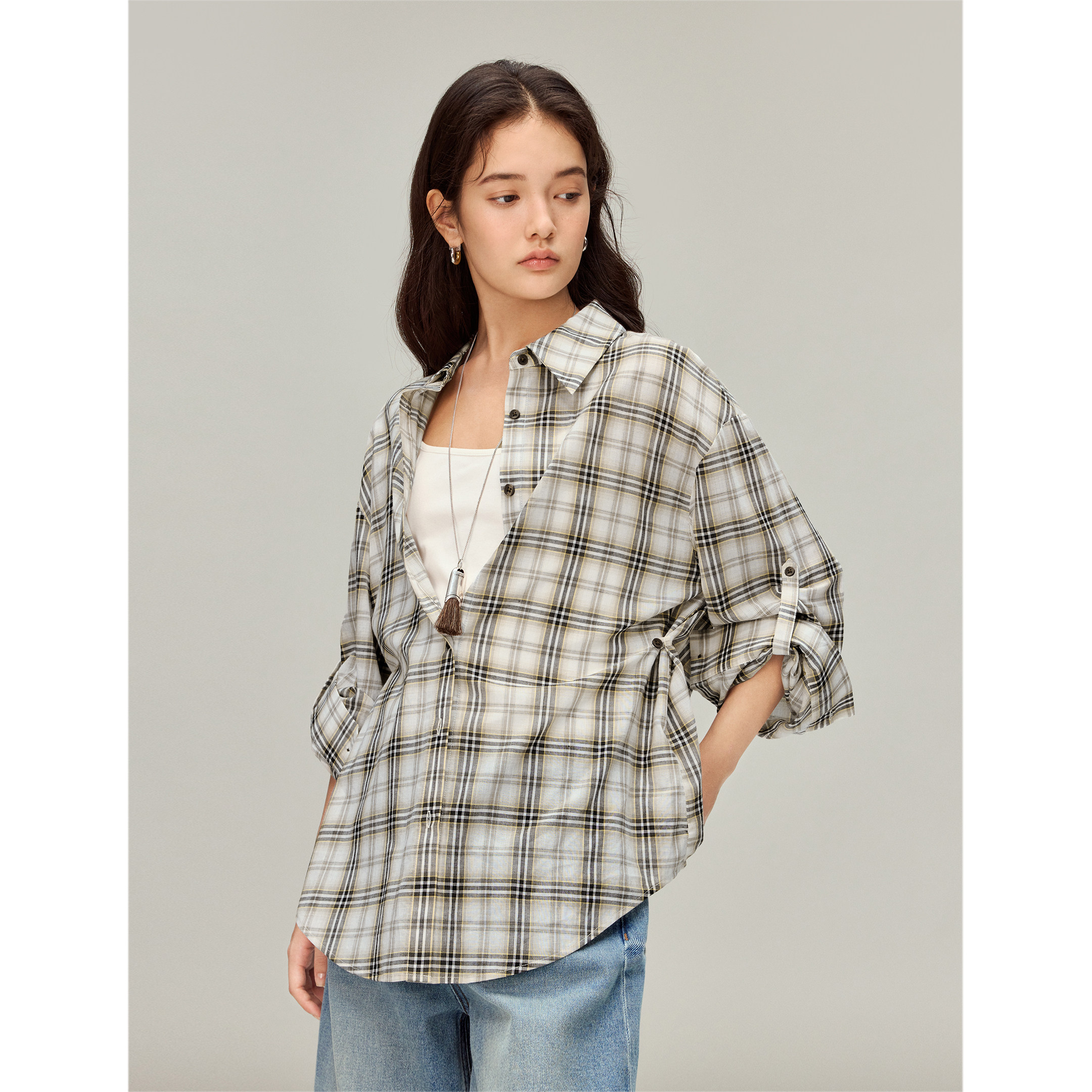 茵曼复古色织格纹衬衫2026春季女装新款简约肌理感宽松格子外套