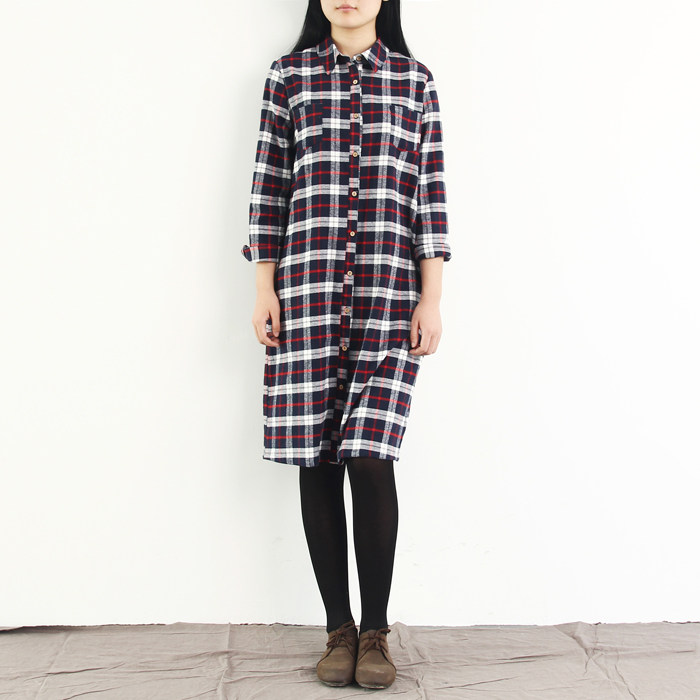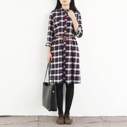 2025秋装女装宽松显瘦通勤百搭棉 格子中长款长袖衬杉连衣裙