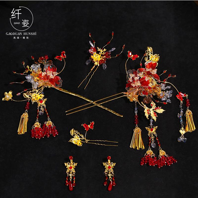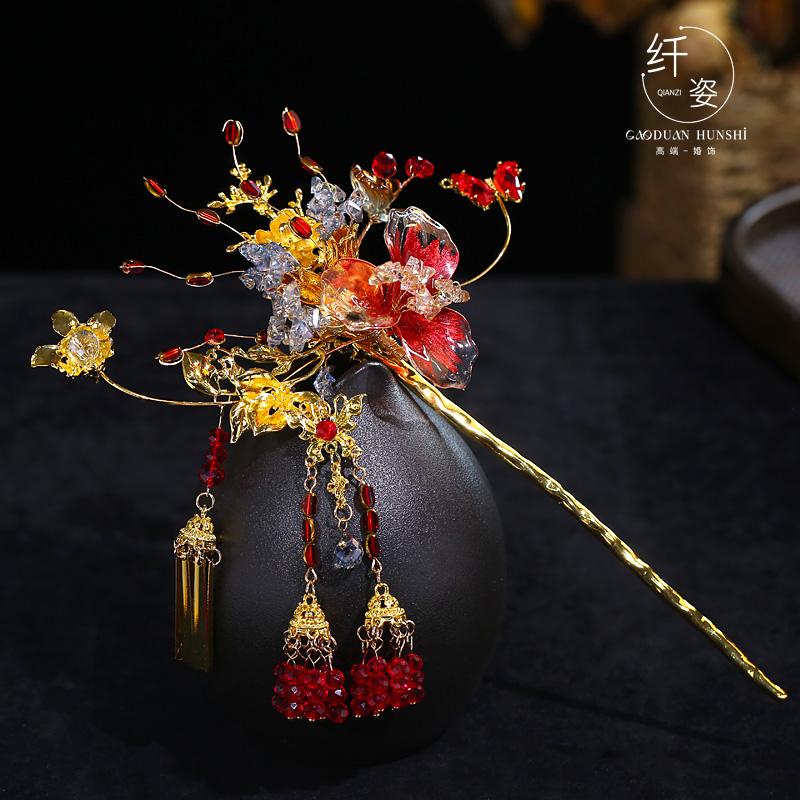 中式秀禾服头饰新娘2024新款结婚龙凤褂红色发簪发饰古典高级配饰