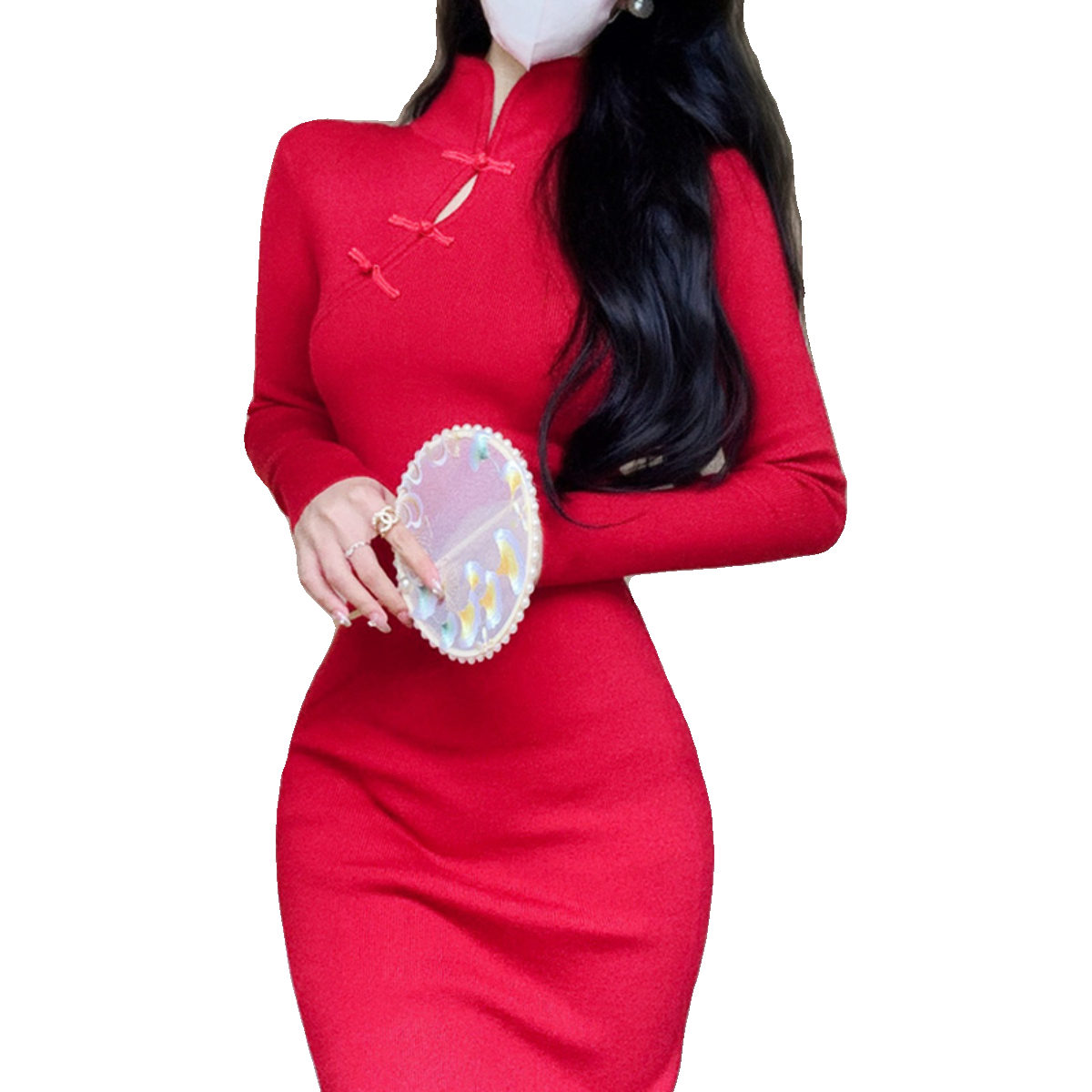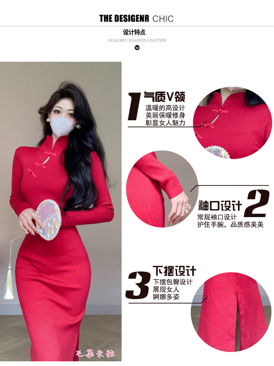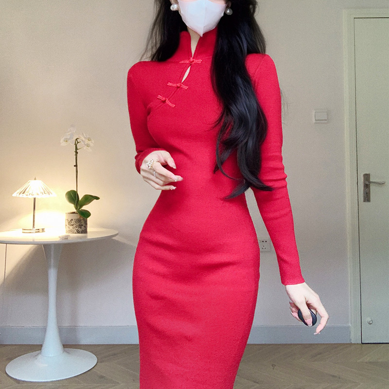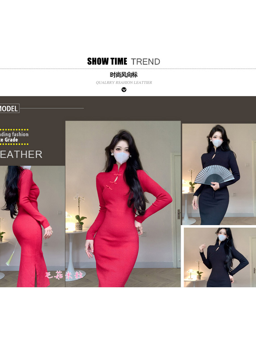 新中式国风改良旗袍针织连衣裙女秋冬复古盘扣修身包臀开叉打底裙