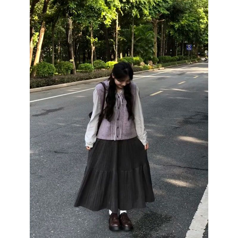 韩系时尚学院风针织马甲背心女叠穿衬衫上衣+高腰A字长裙三件套装