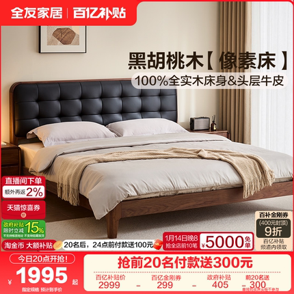 全友家居进口黑胡桃木头层牛皮床