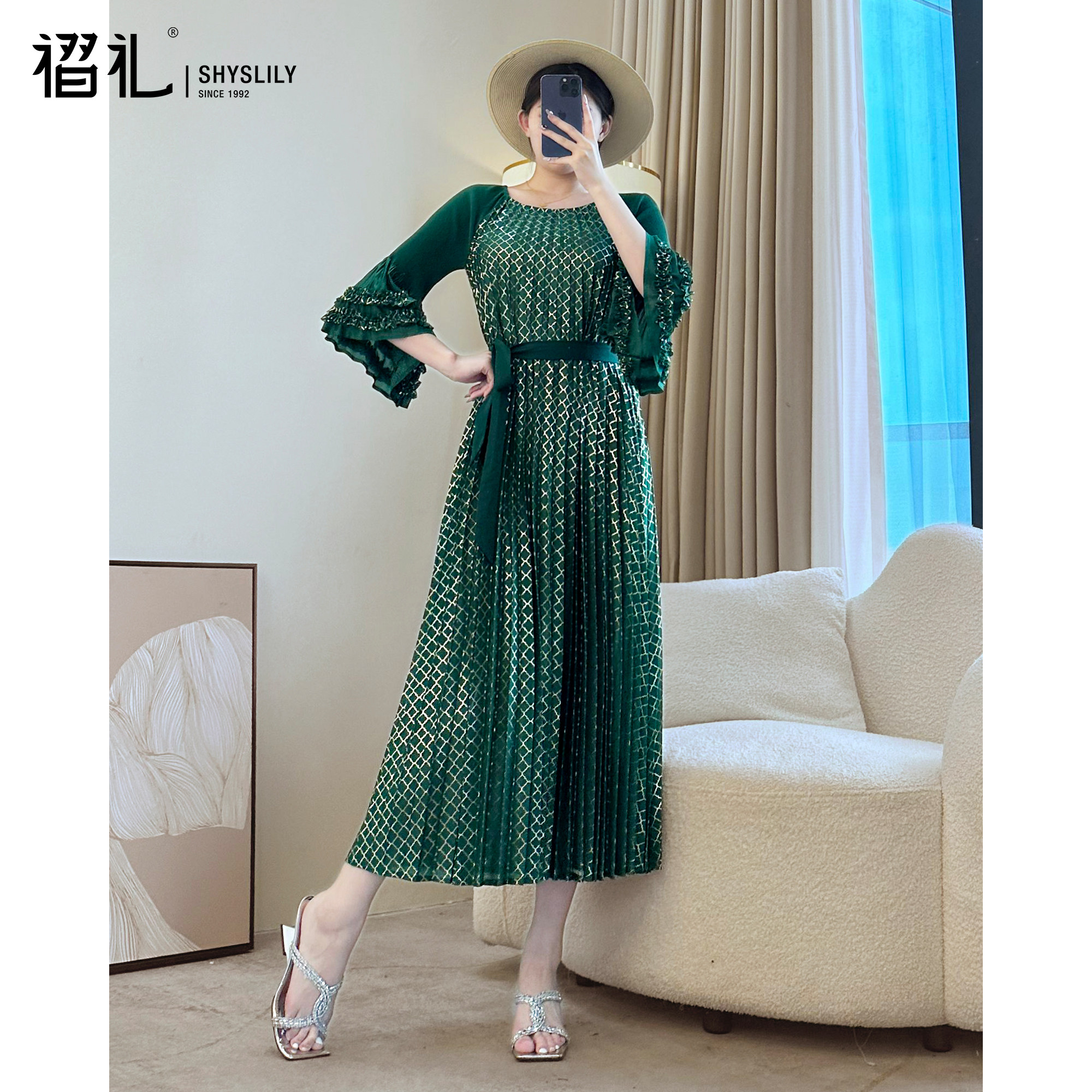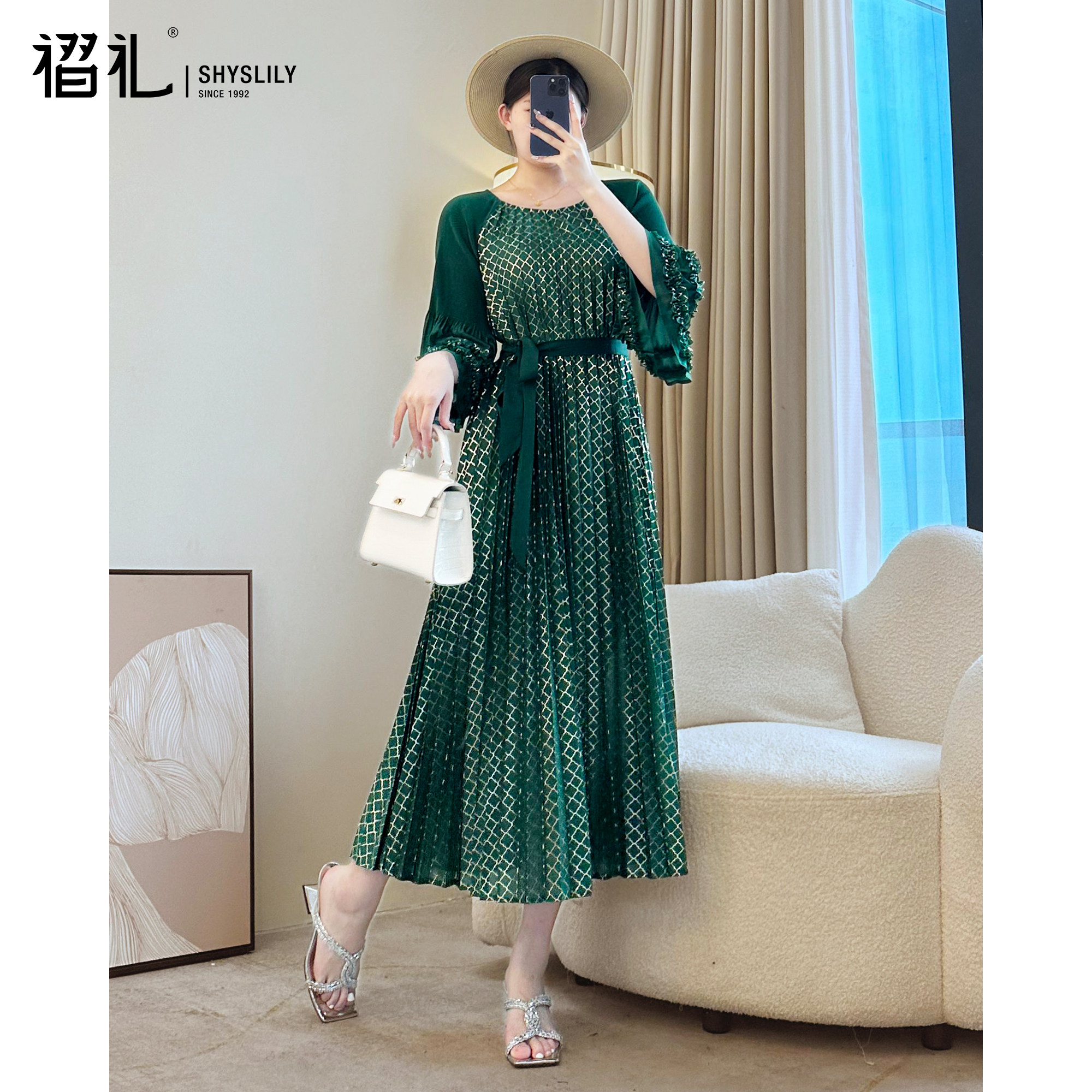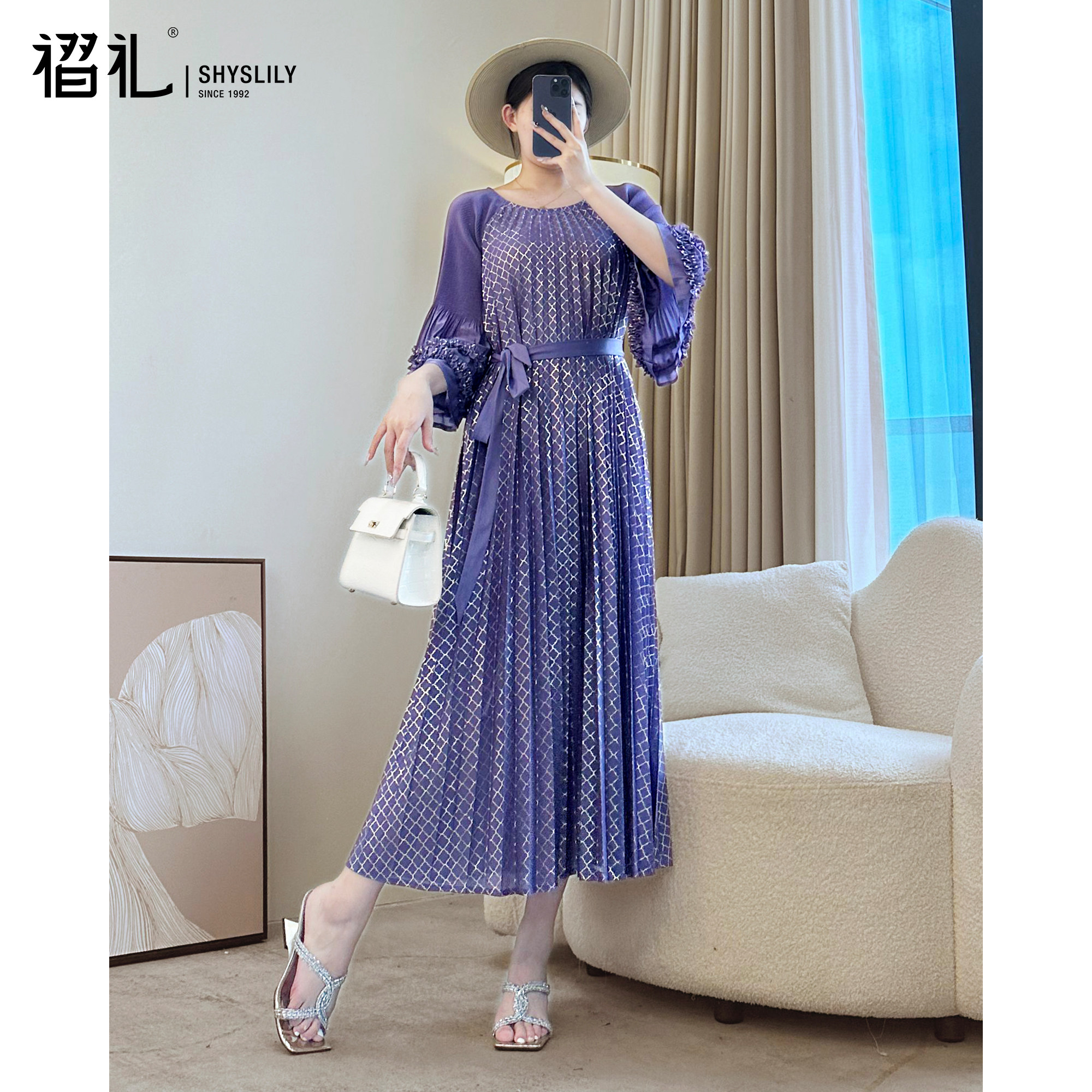 三宅气质名媛玫红色连衣裙春季高端礼服长裙褶皱宽松百褶裙妈妈装