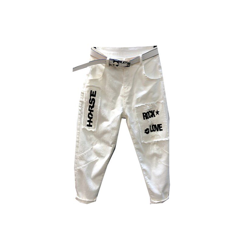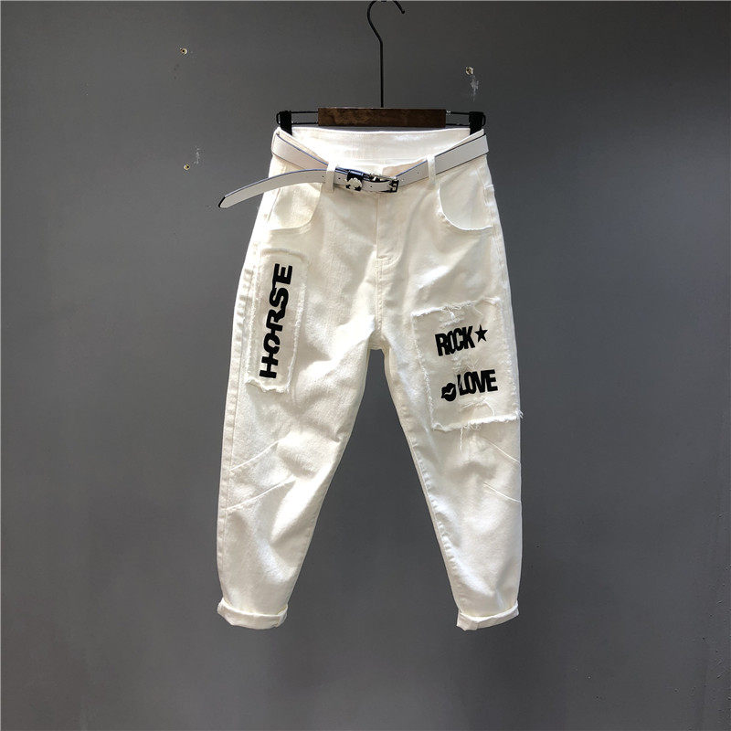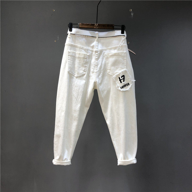 欧洲站春秋新款白色贴布小脚显瘦牛仔哈伦裤宽松大码老爹裤女
