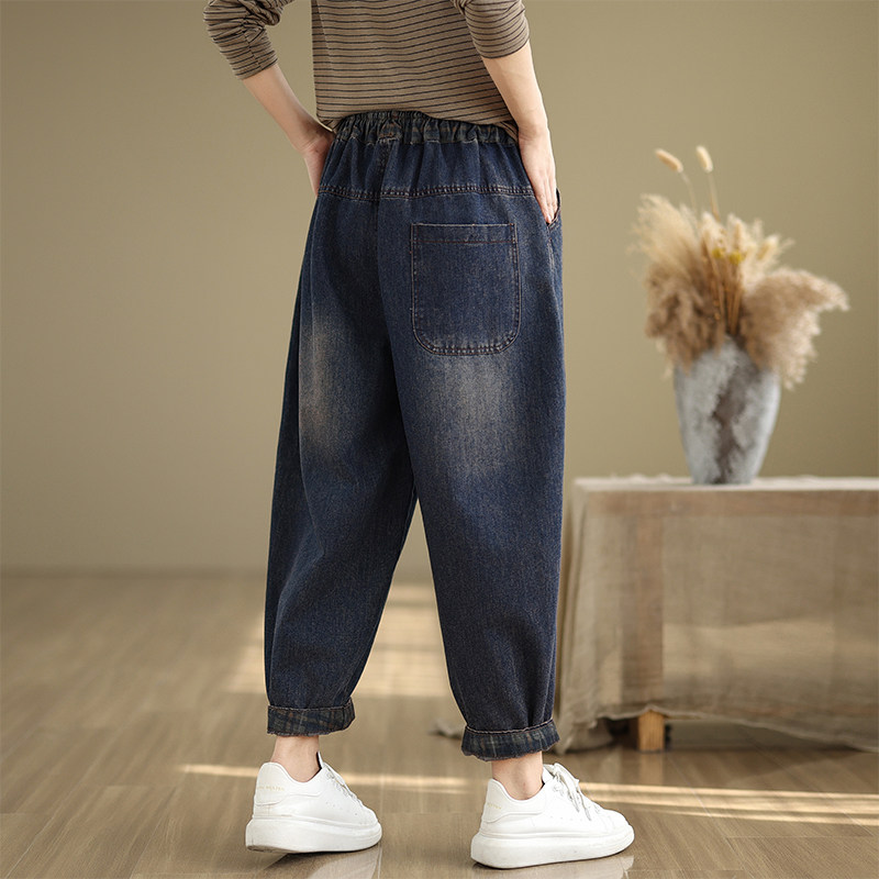 小菲家~新款春秋纯色休闲松紧腰牛仔九分哈伦裤女