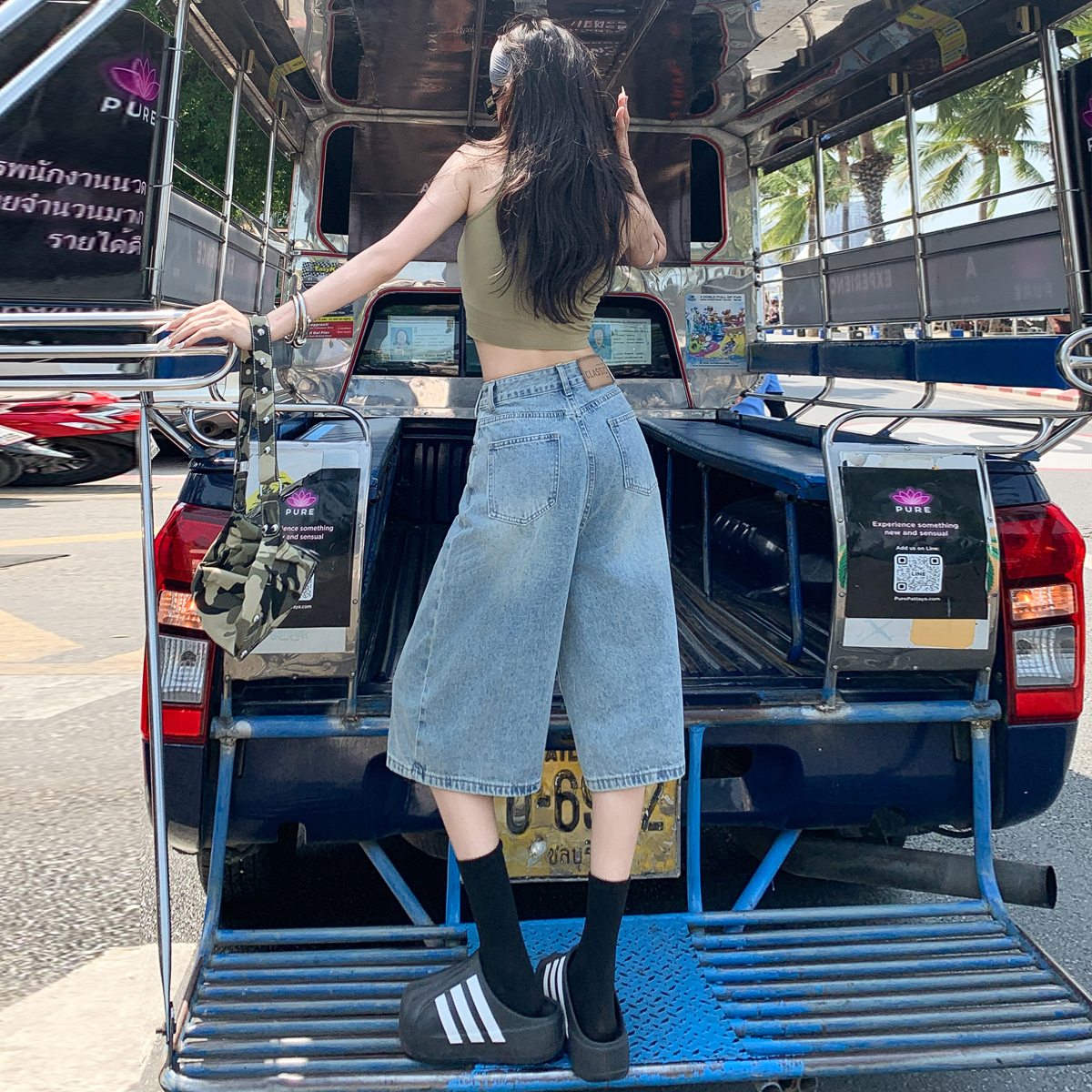 美式复古阔腿牛仔七分裤女2025夏季薄款新款高腰宽松直筒中短裤