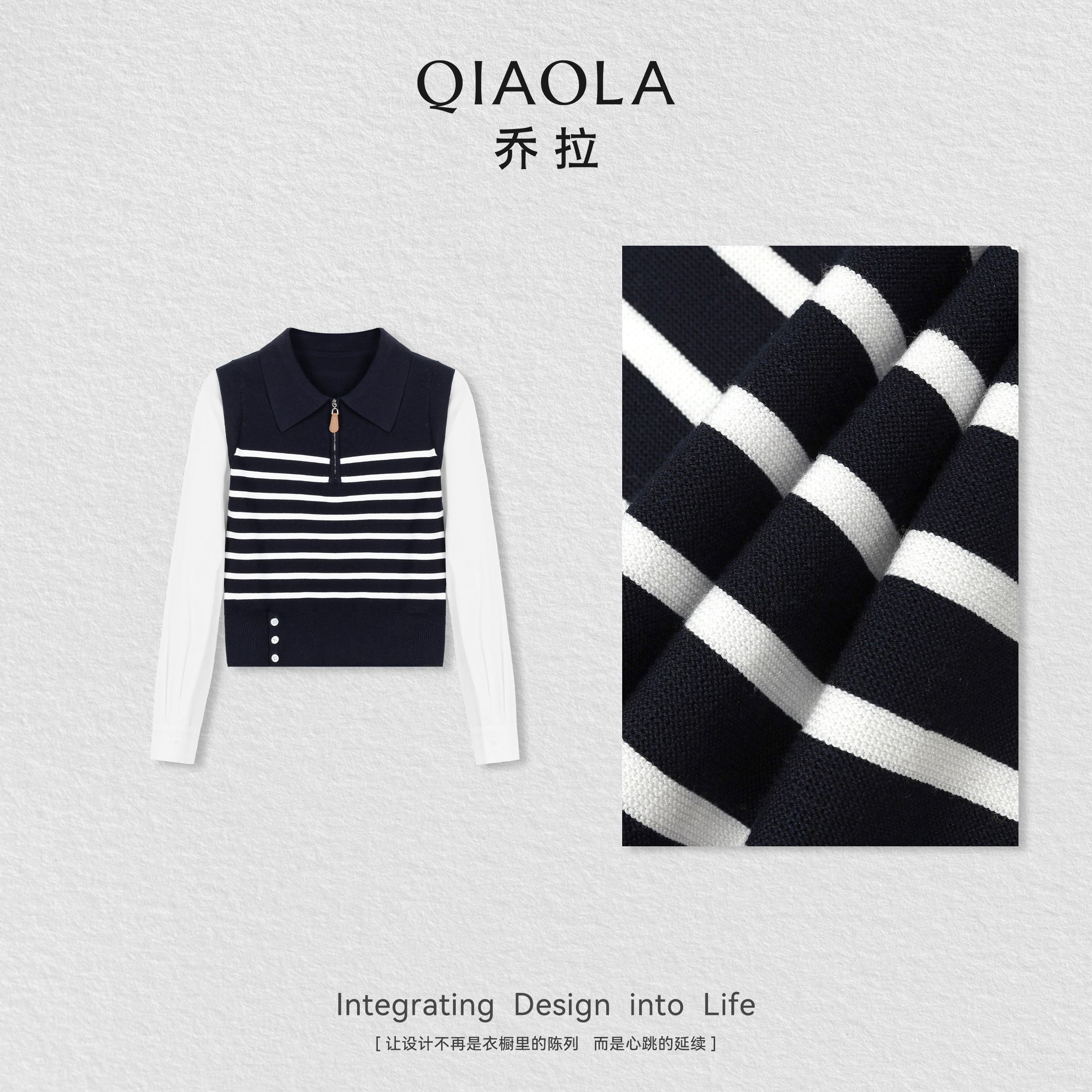 乔拉【首尔日记】秋季新款藏青色翻领拼接背心长袖上衣半裙套装女