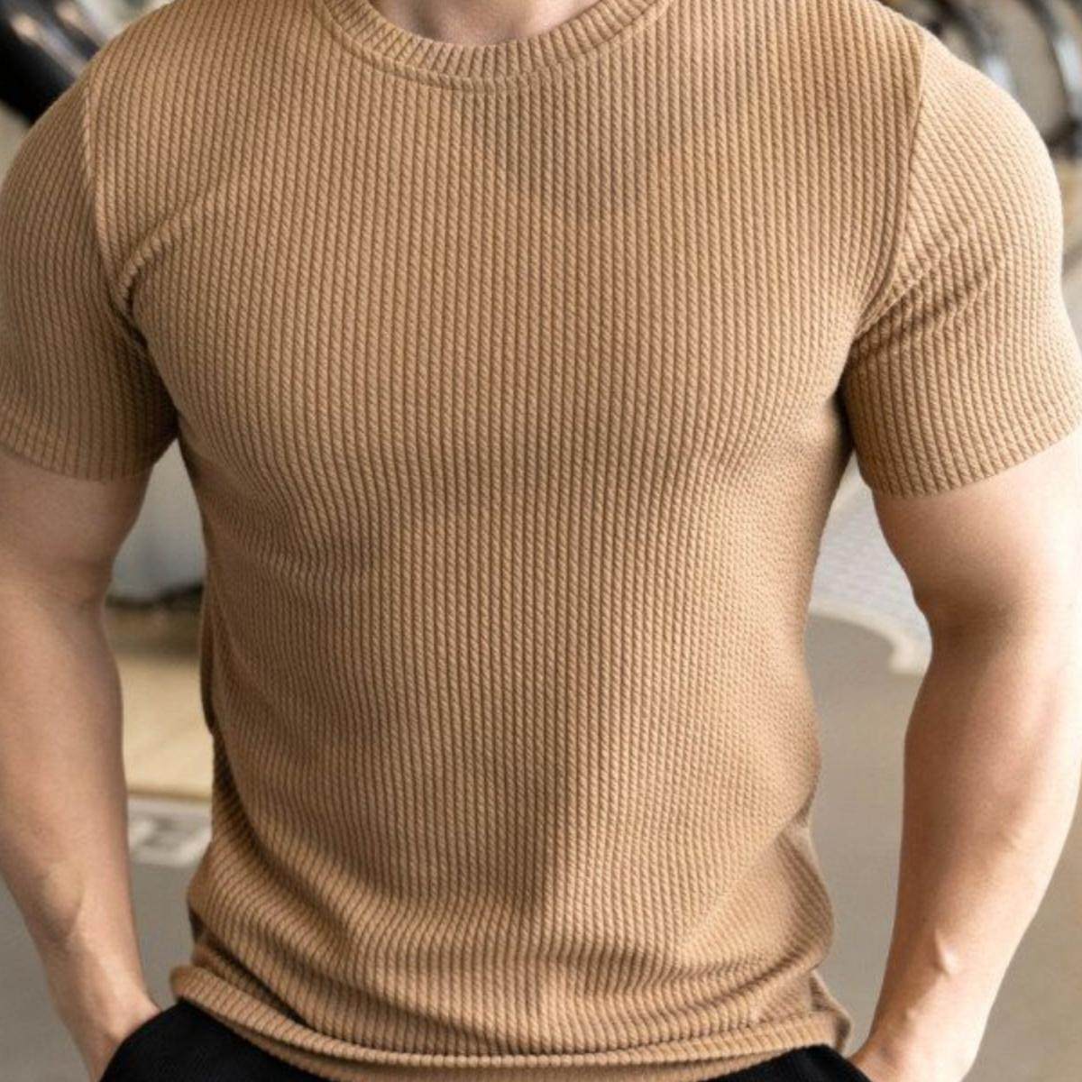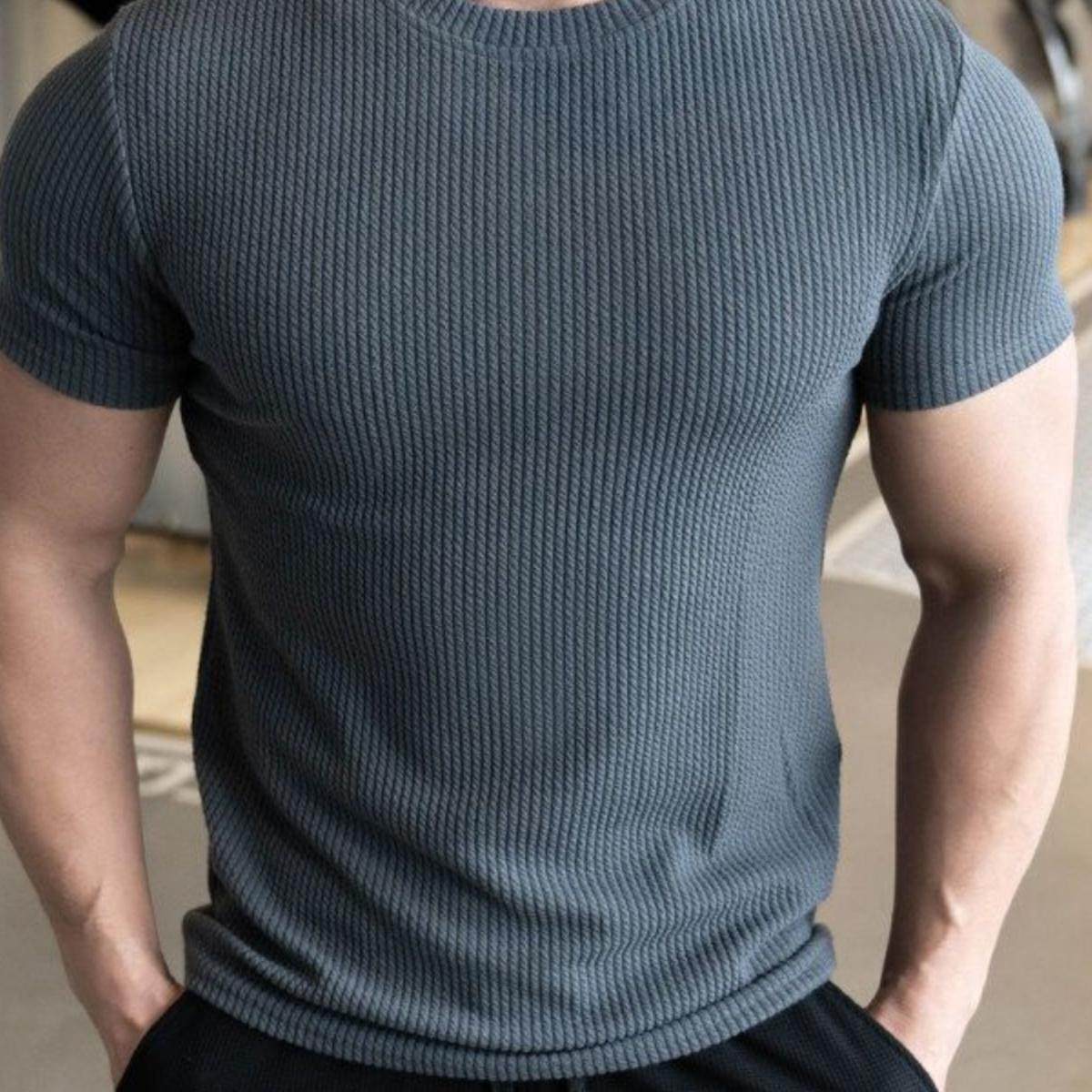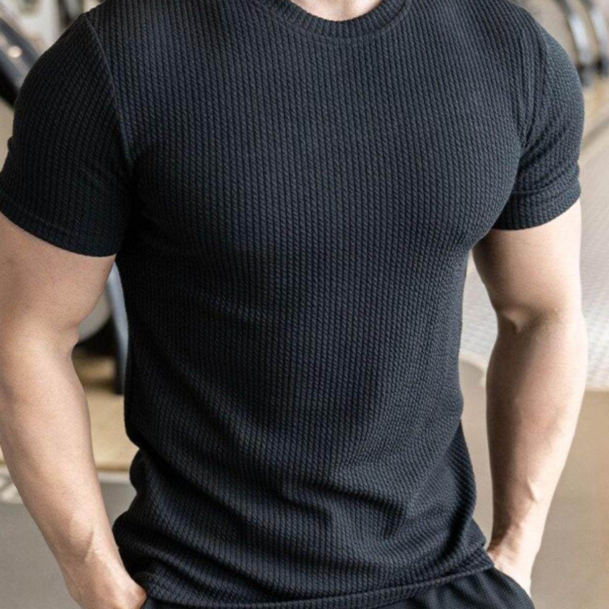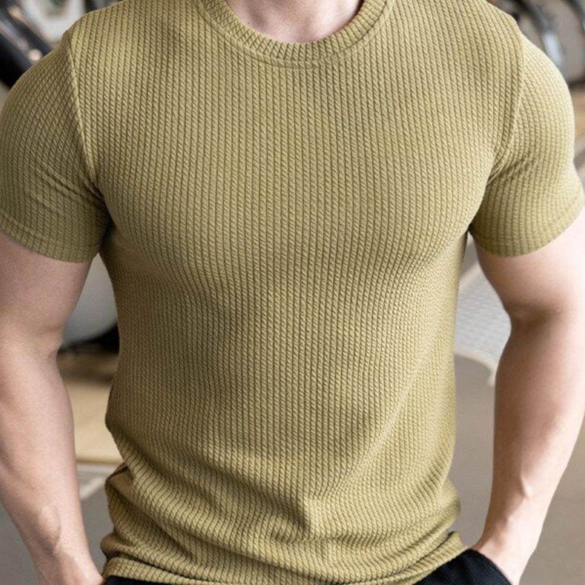 美式小领口紧身衣肌肉男褶皱肌理感修身型短袖华夫格提花针织t恤