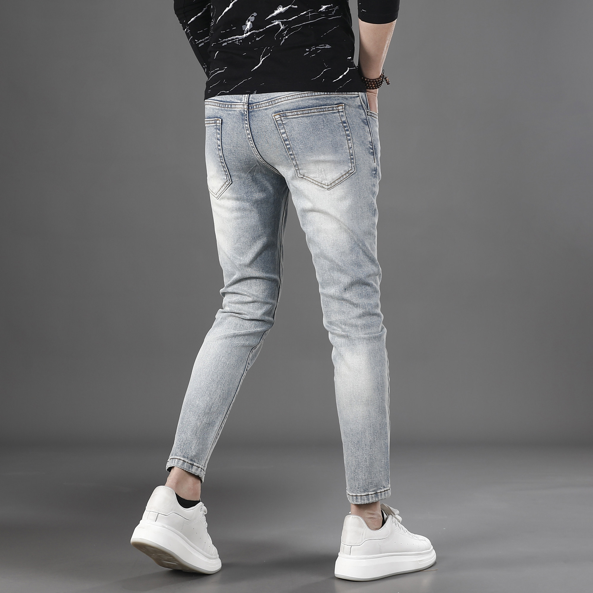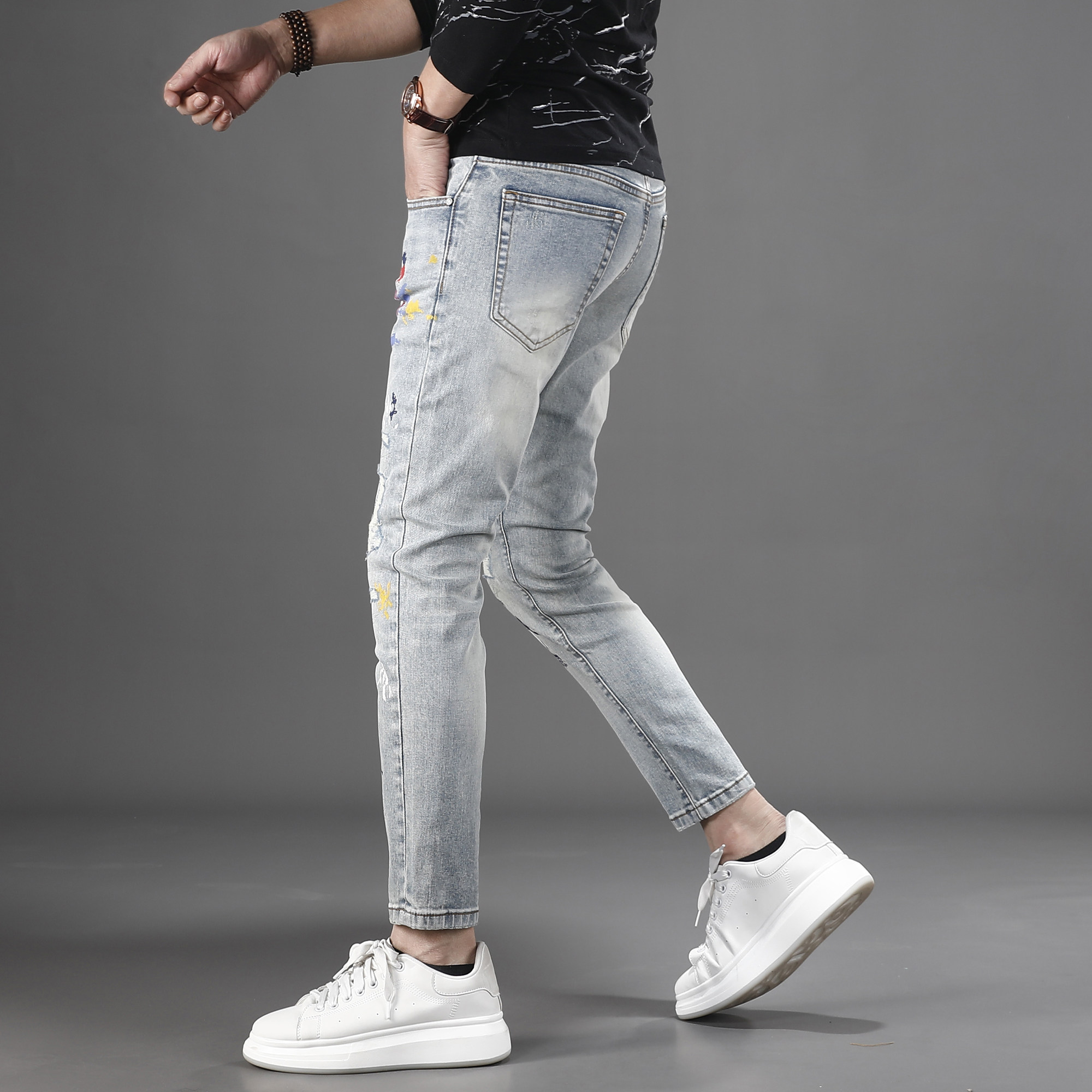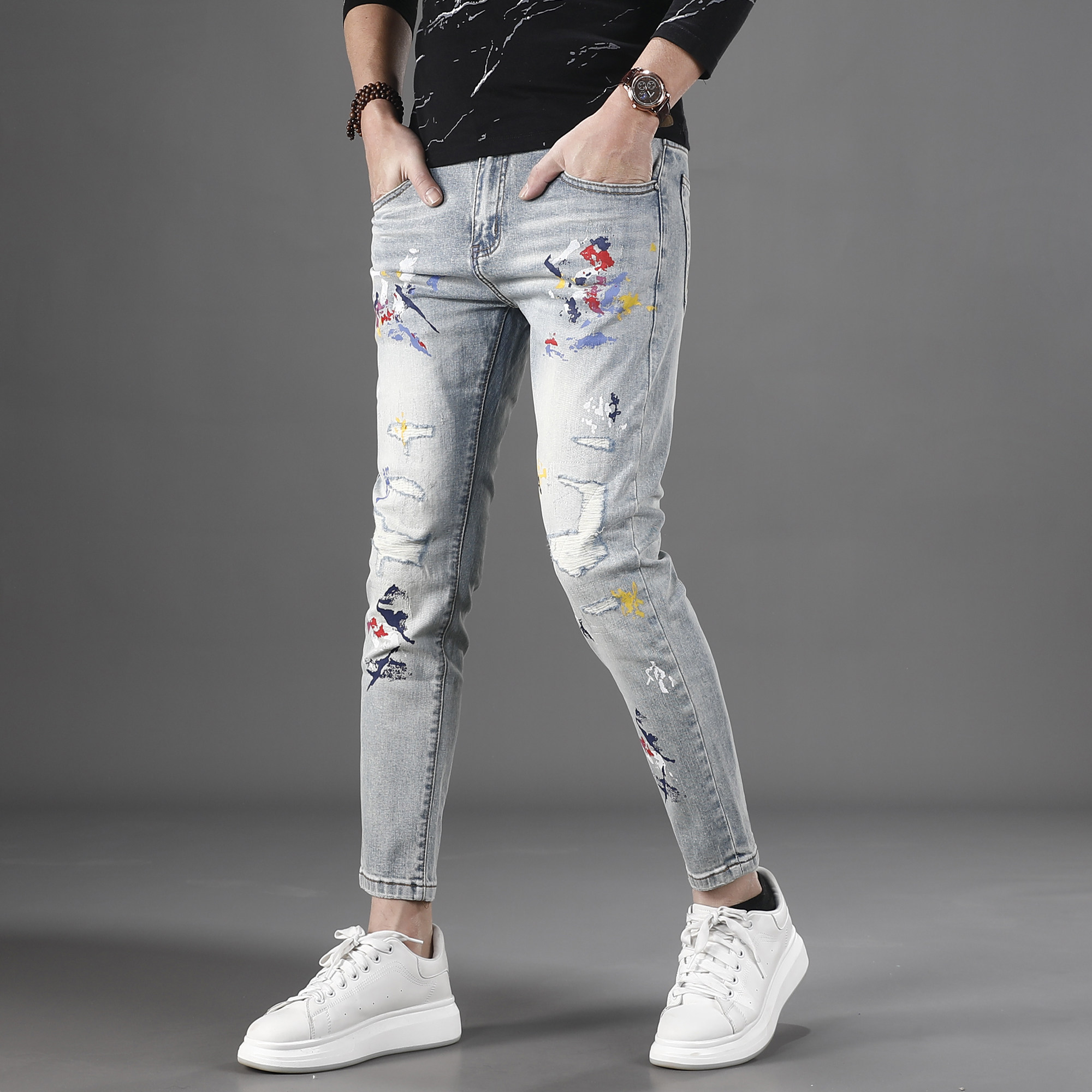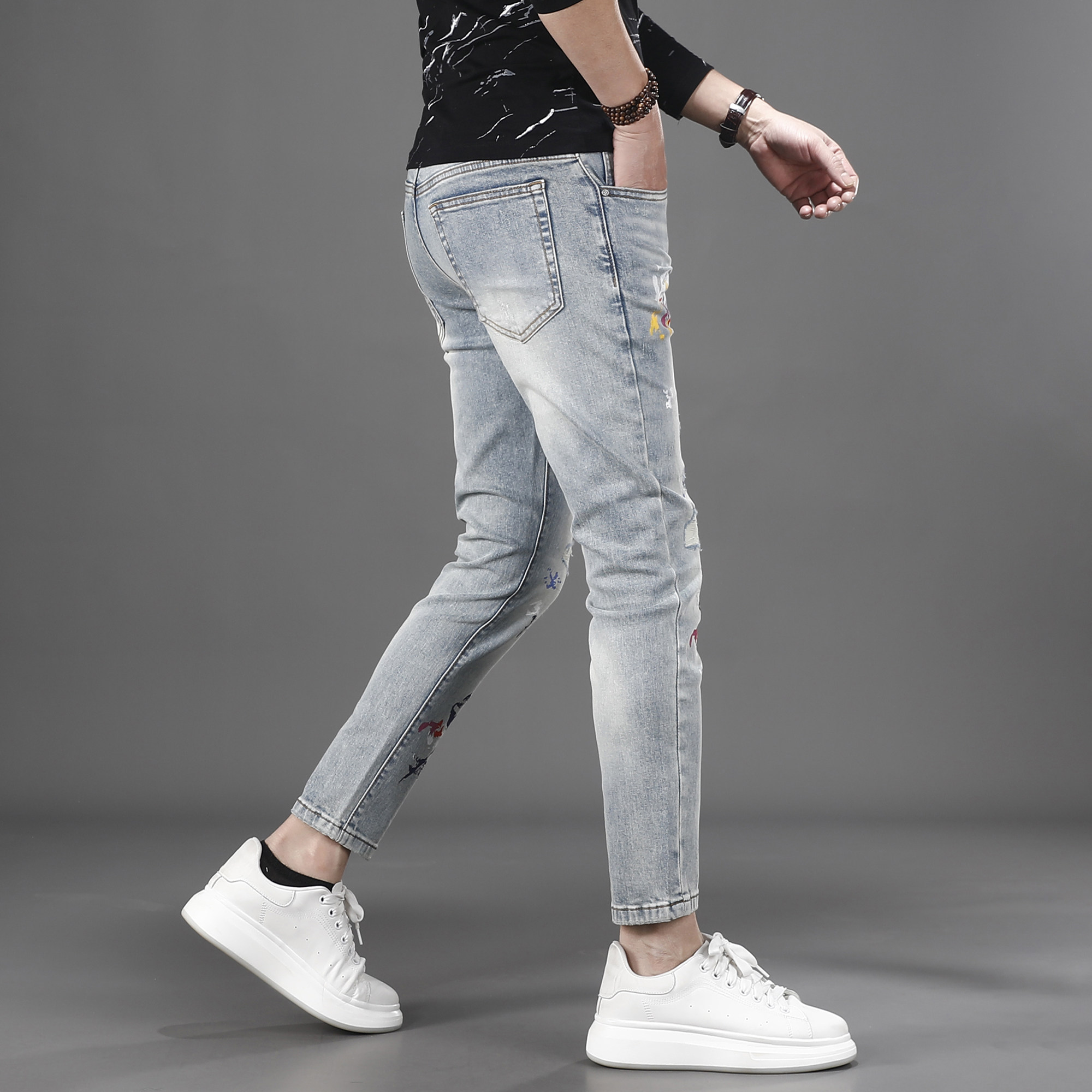 2026新款时尚破洞补丁油漆涂鸦牛仔裤男九分修身小脚痞帅9分裤子