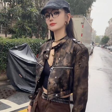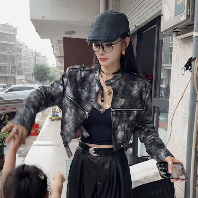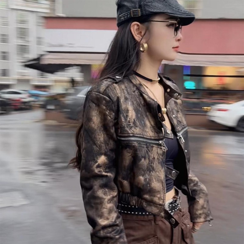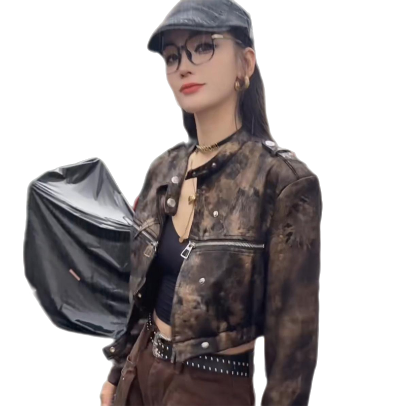 美式复古扎染立领工装夹克外套女春装新款设计感小众休闲短款上衣