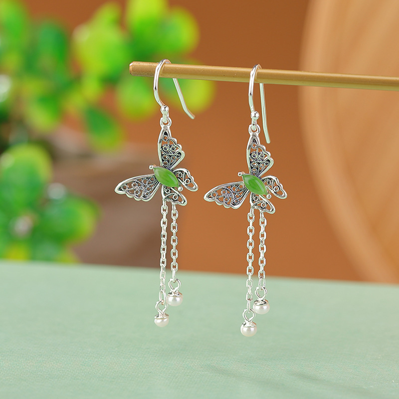 轻奢高级感s925纯银和田碧玉复古做旧蝴蝶流苏耳坠国风气质耳环女