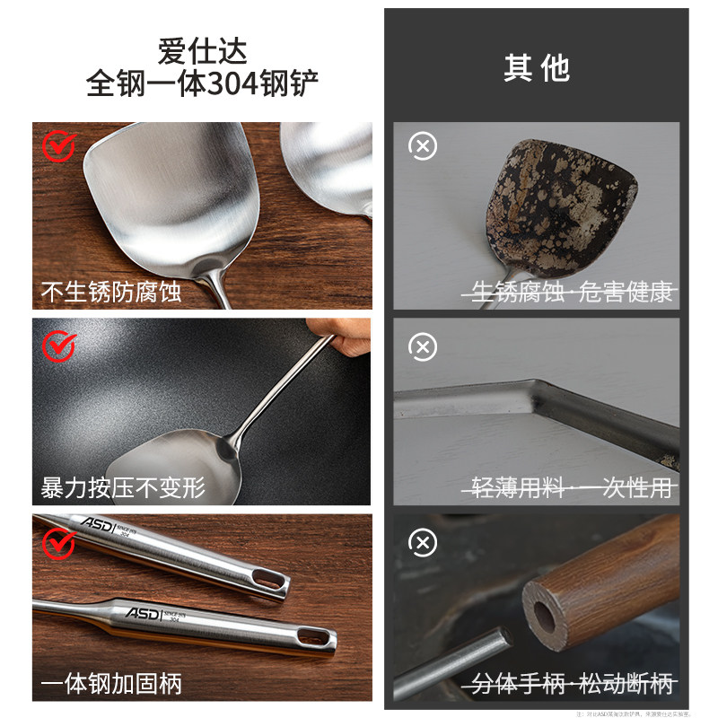 爱仕达锅铲304不锈钢加厚炒菜铲子厨具食品级家用炒勺套装铁铲