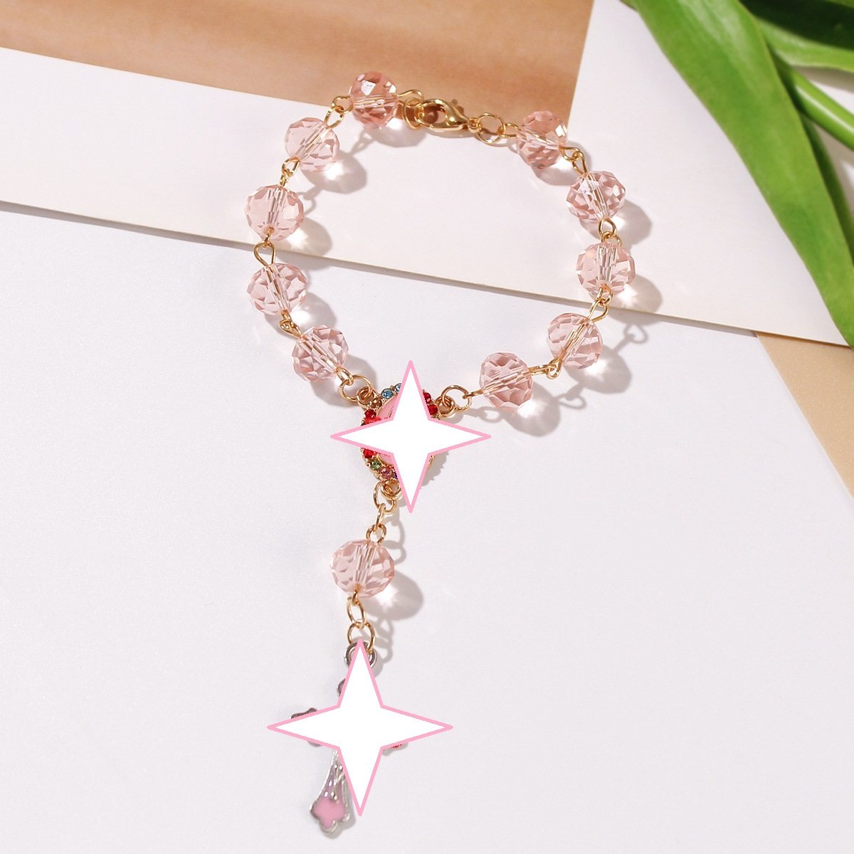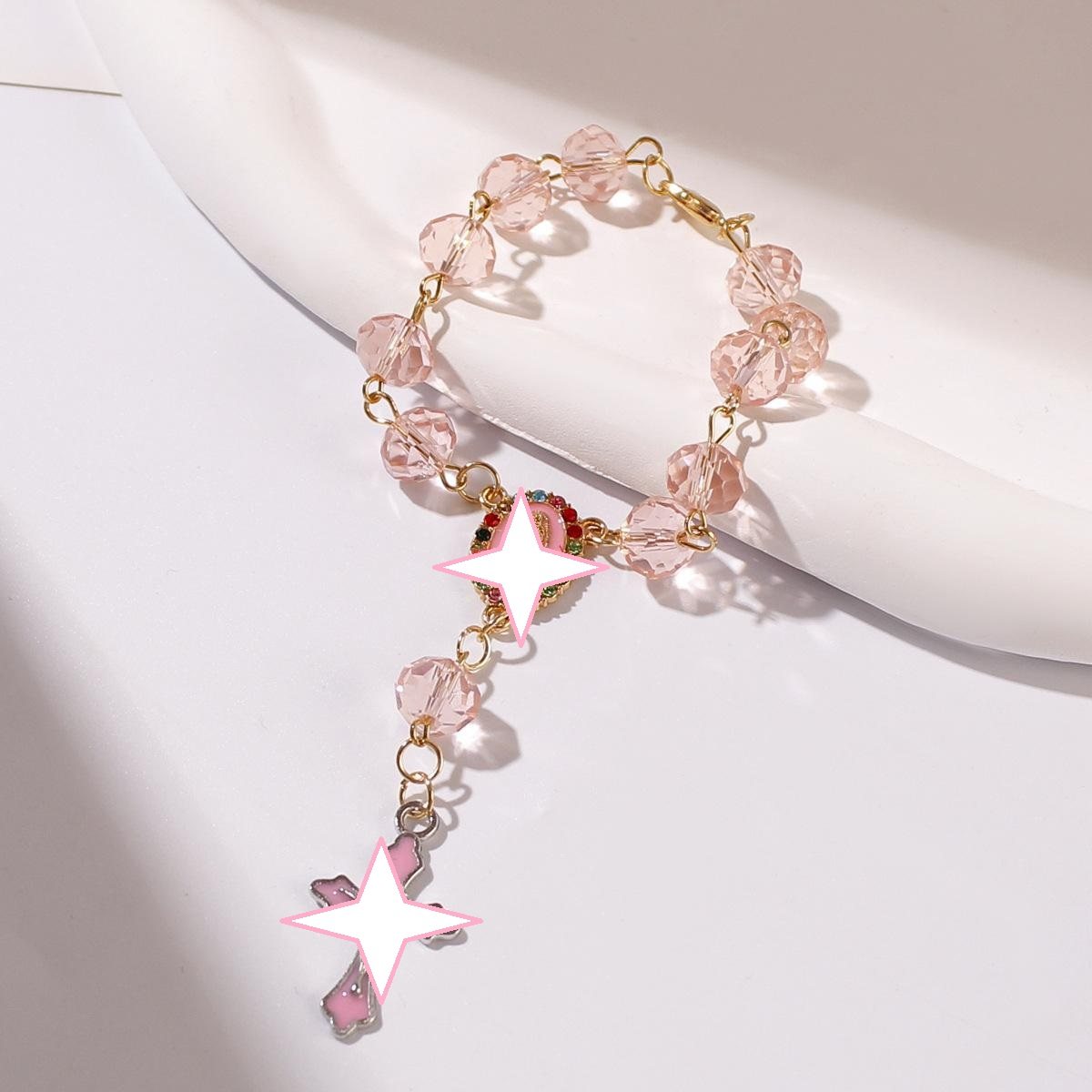 粉色水晶十字架念珠手链串珠