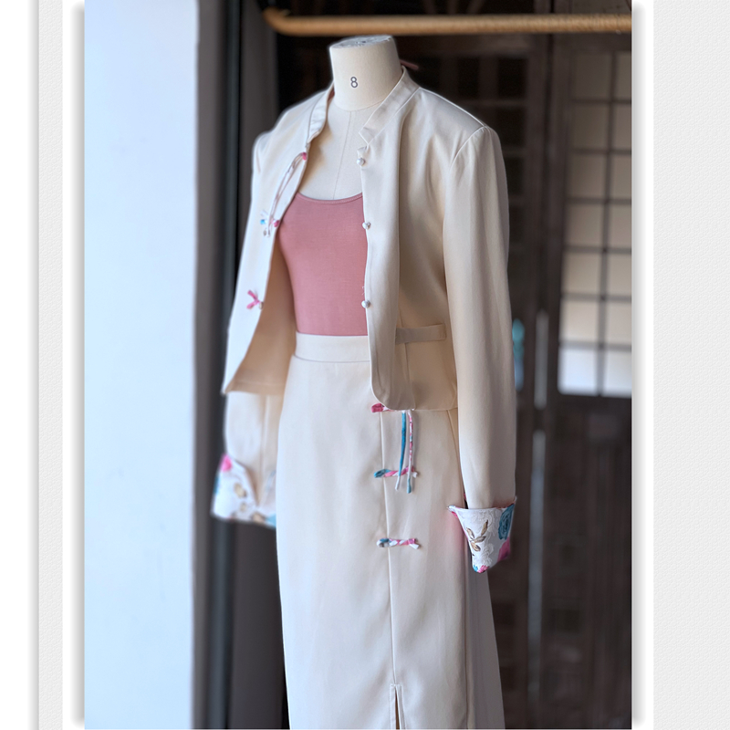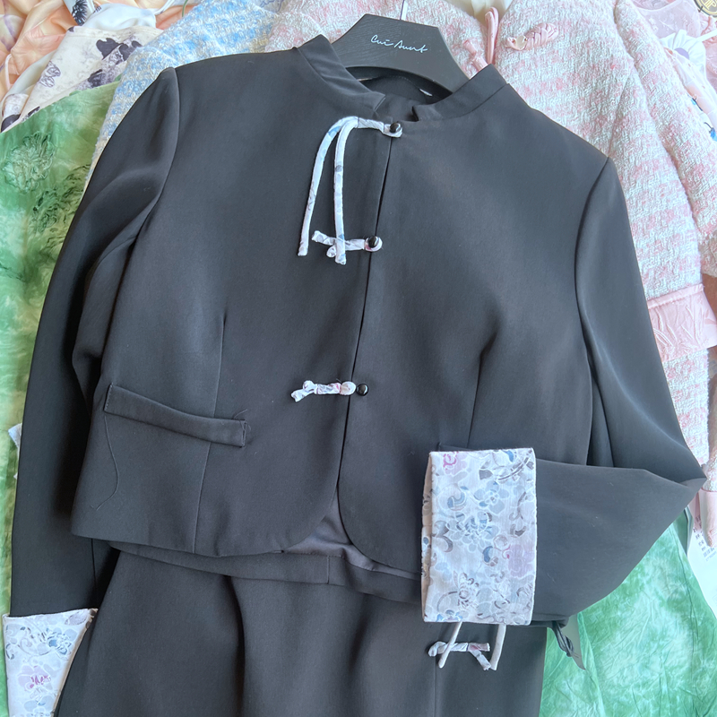 新国风西装短外套加开叉半身裙套装两件套 中式挽袖唐装大热款