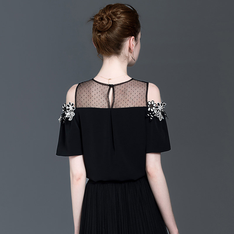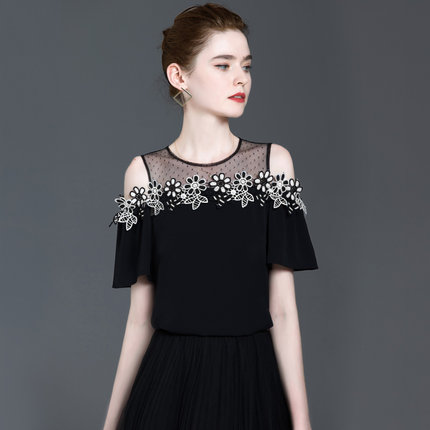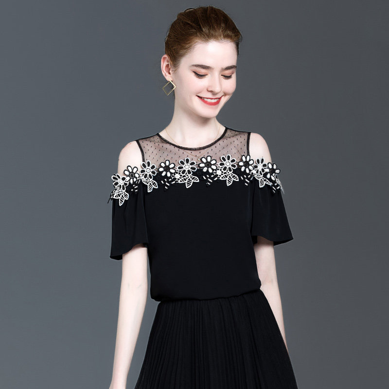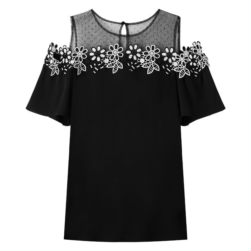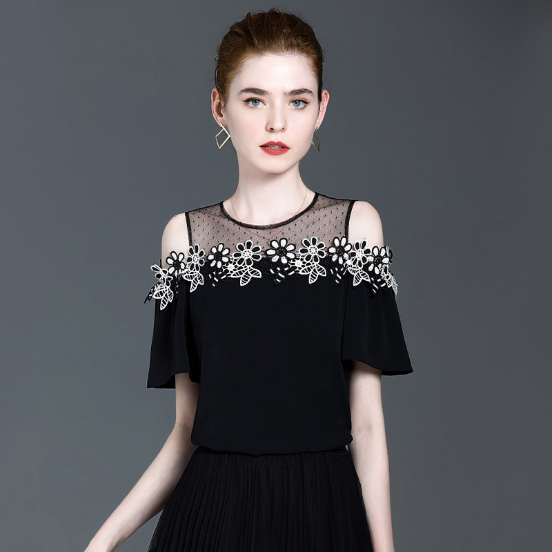 黑色蕾丝上衣女夏季短袖性感露肩网纱t恤女遮肚子显瘦洋气雪纺衫