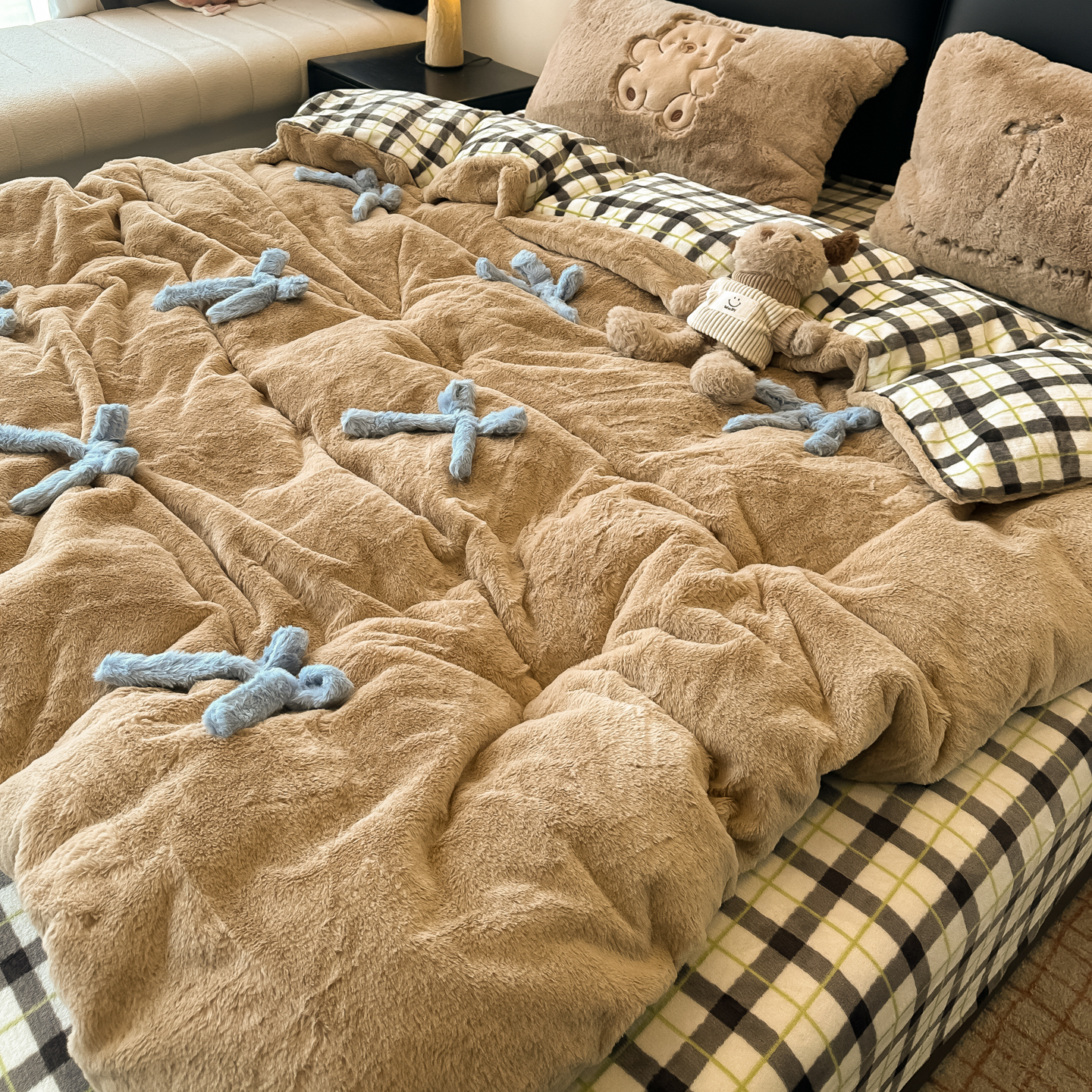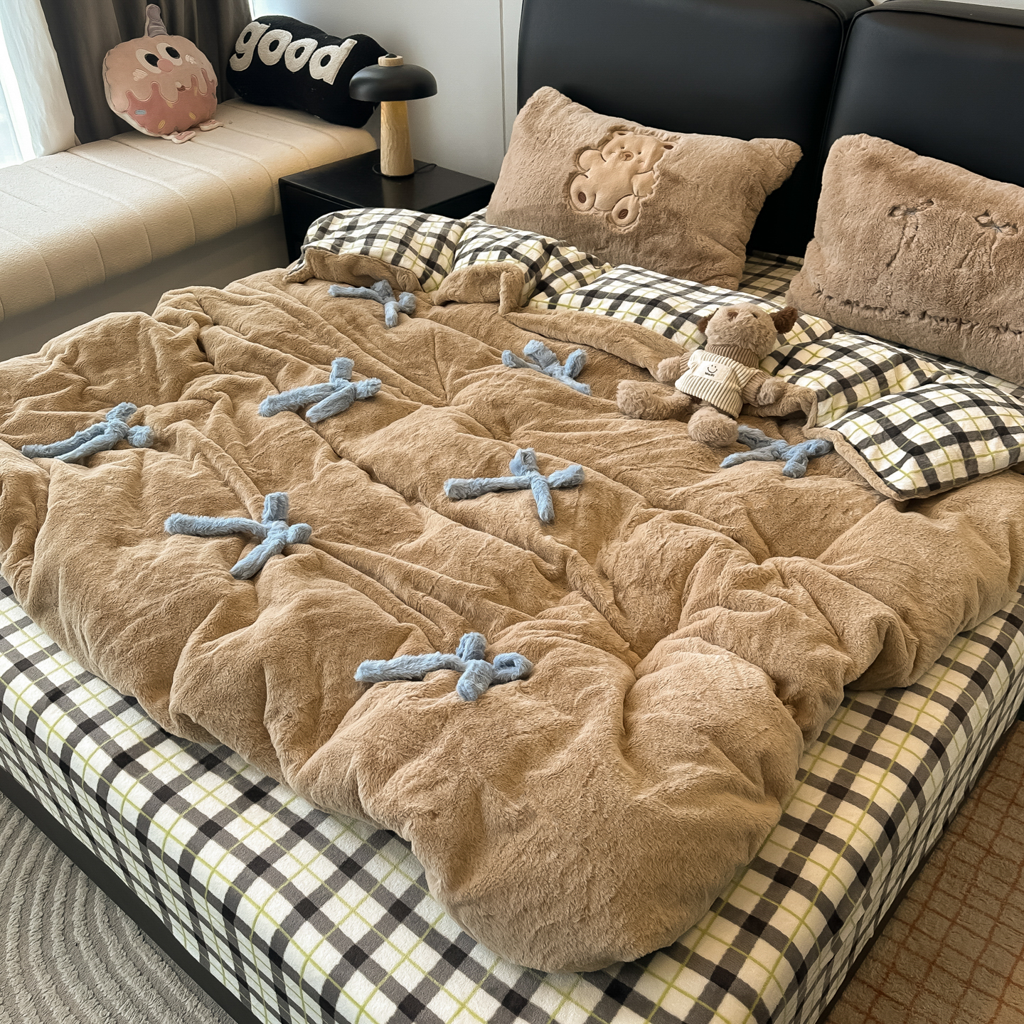 秋冬季小熊蝴蝶结毛巾绣牛奶绒四件套双面珊瑚绒床单被套床三件套