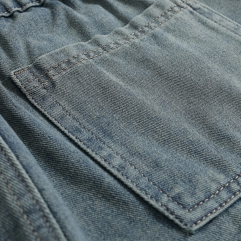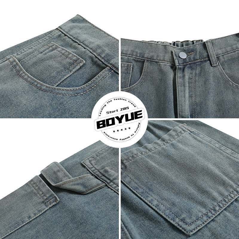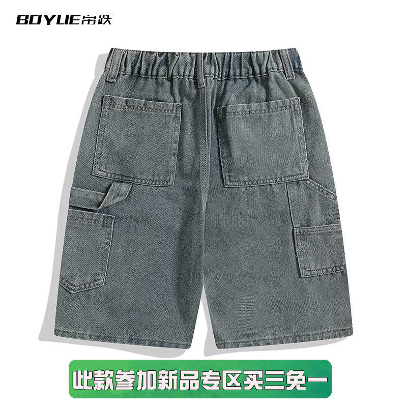 BOYUE帛跃半松紧腰直筒牛仔短裤拼接口袋痞帅青少年工装五分裤男