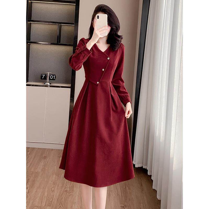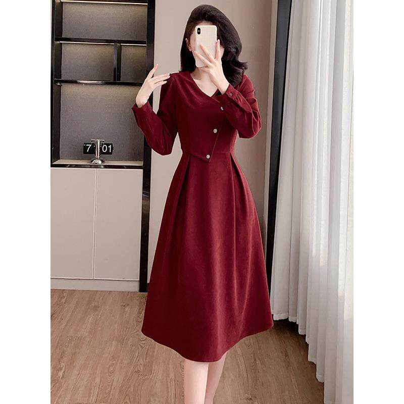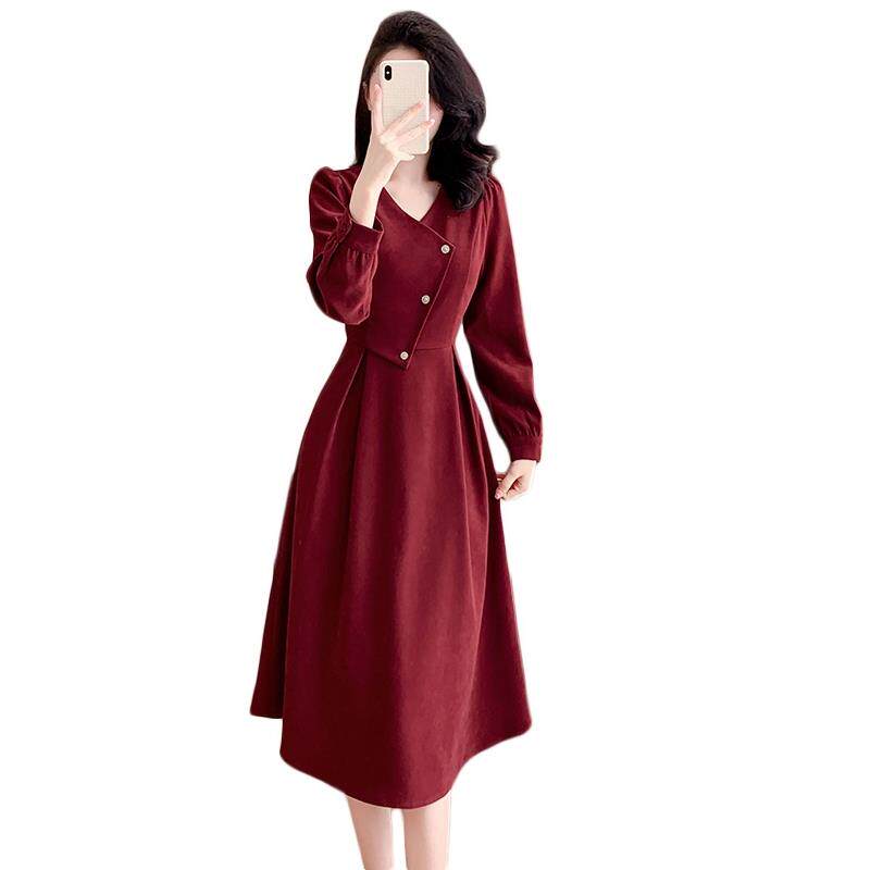 实拍浪漫复古新年红连衣裙女春秋法式赫本磨毛领裙子感