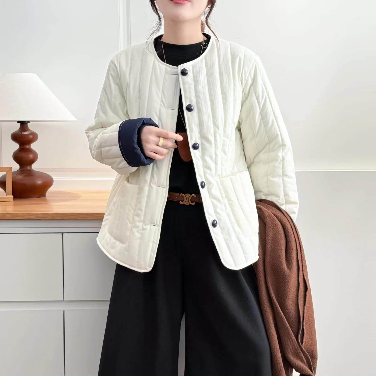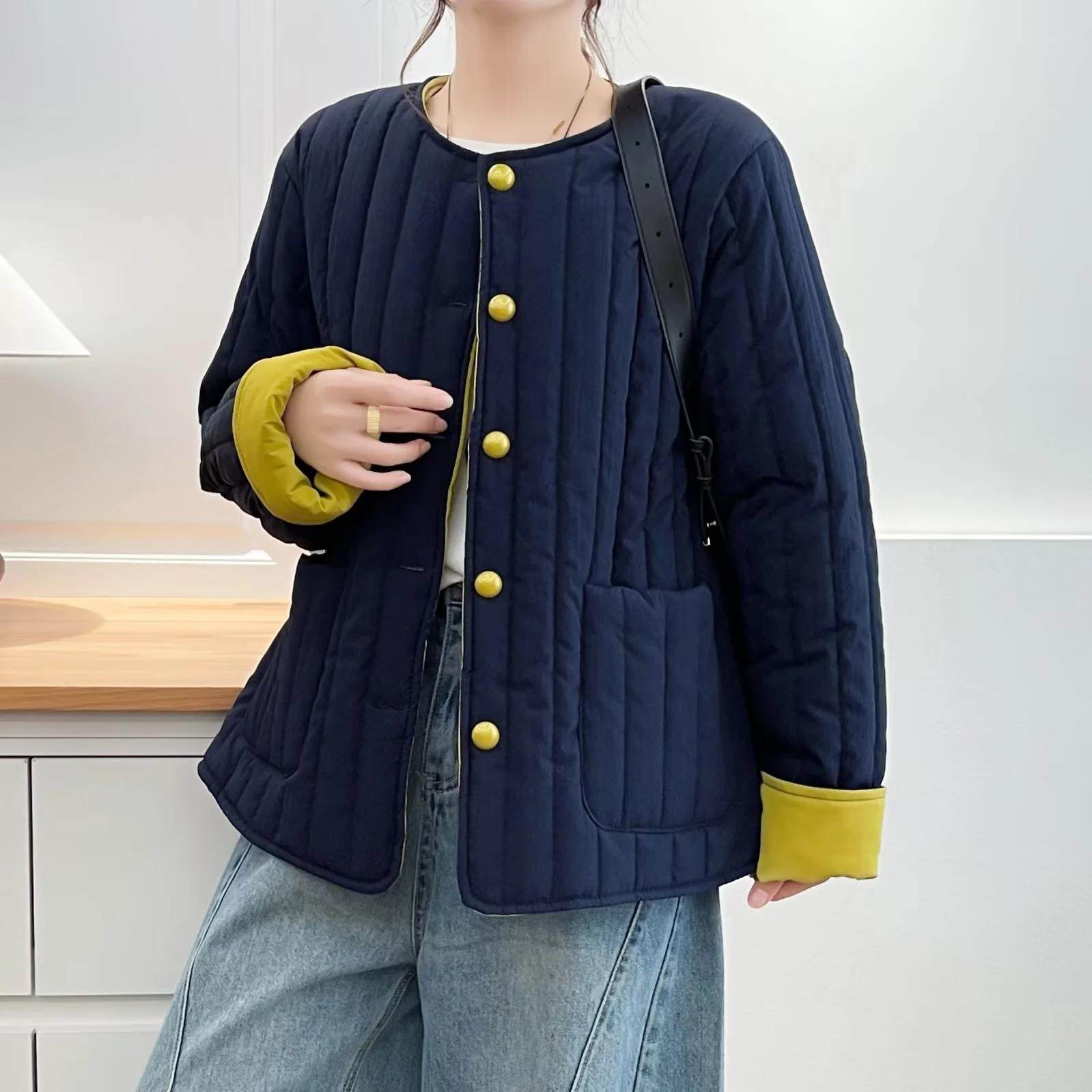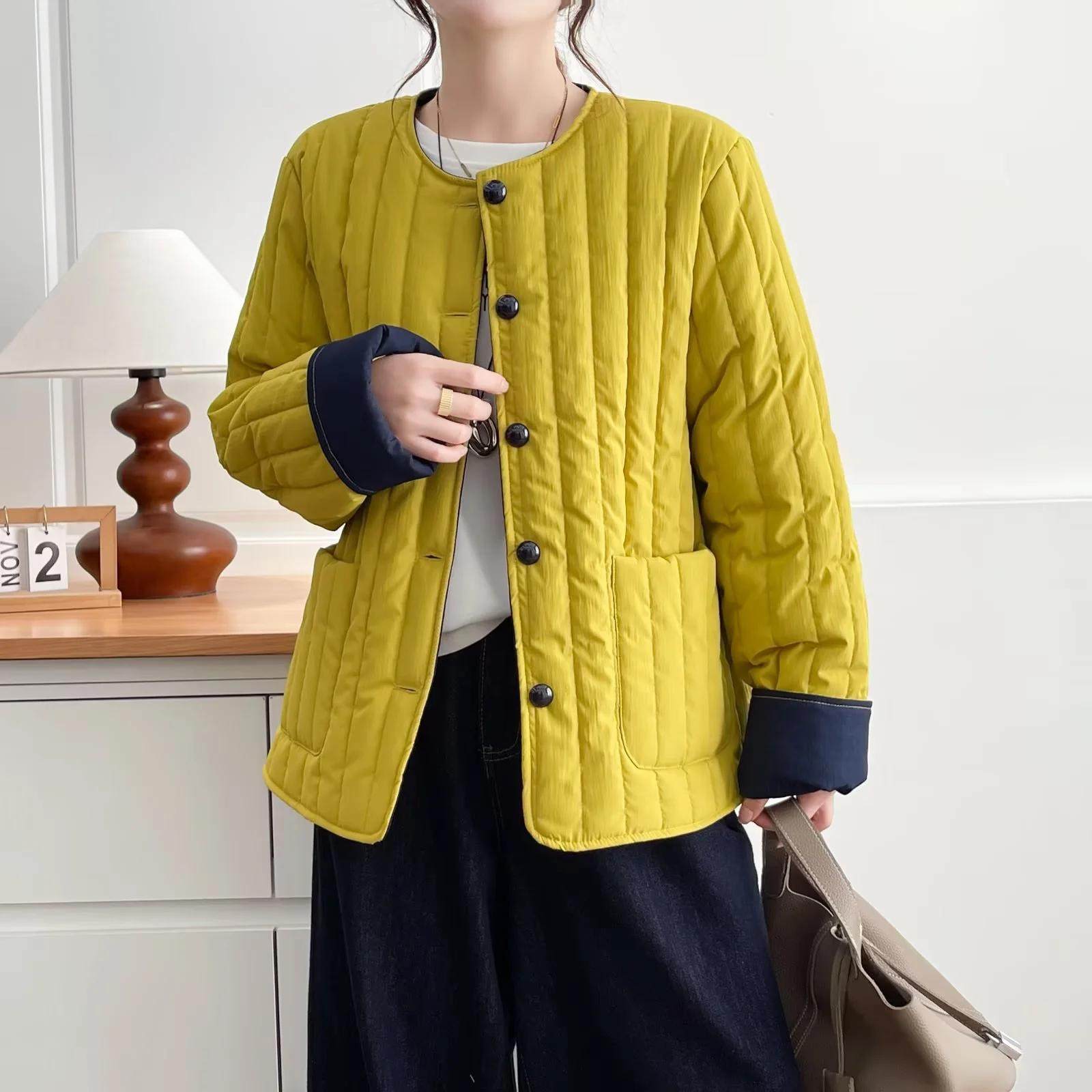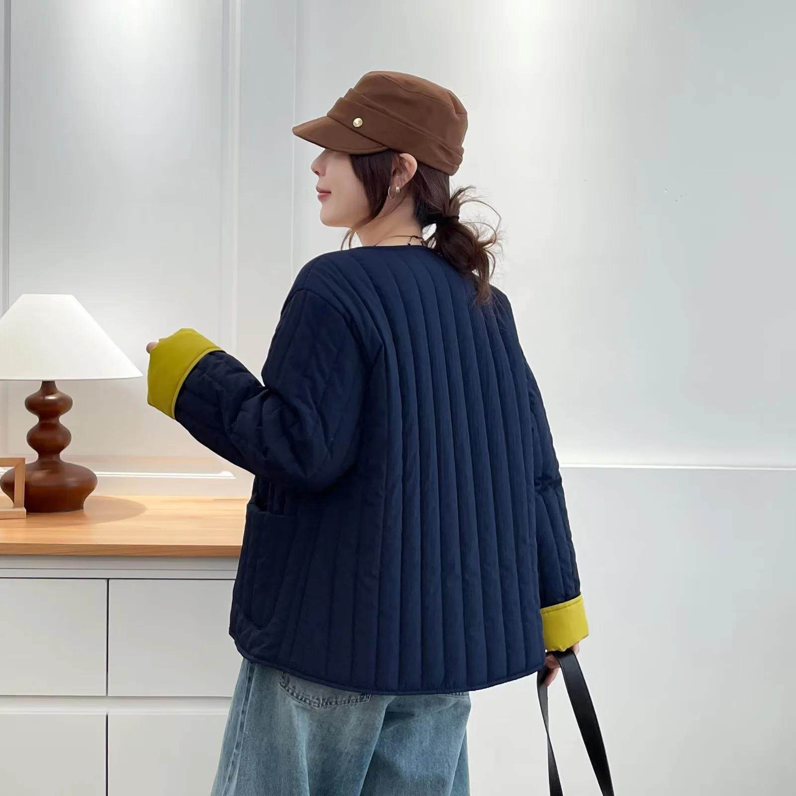 胖mm2025新款女装冬装圆领别致棉服加厚中年大码竖纹压棉女棉衣