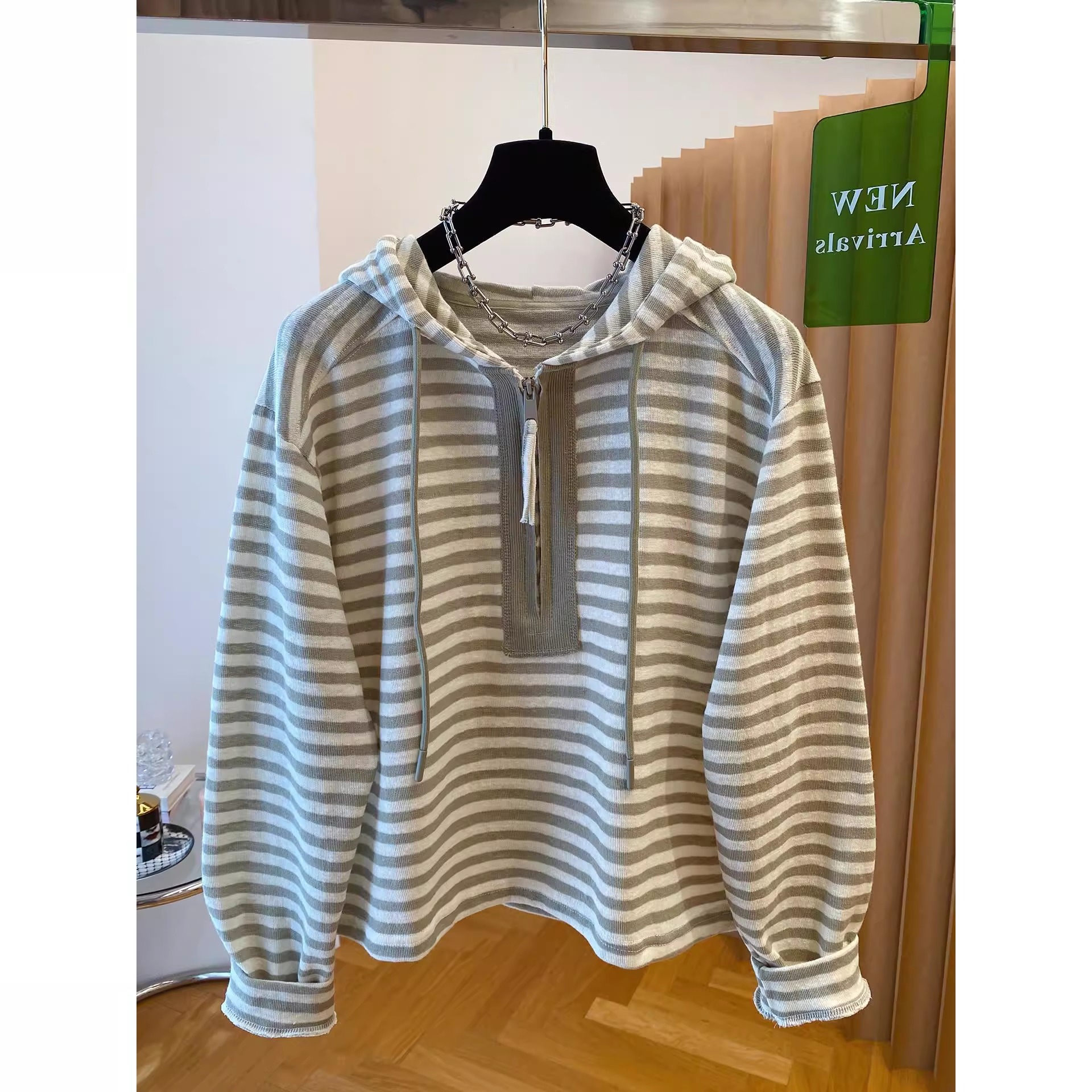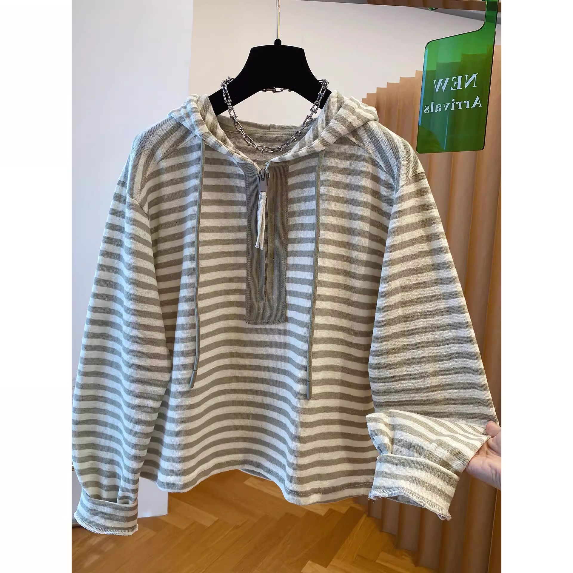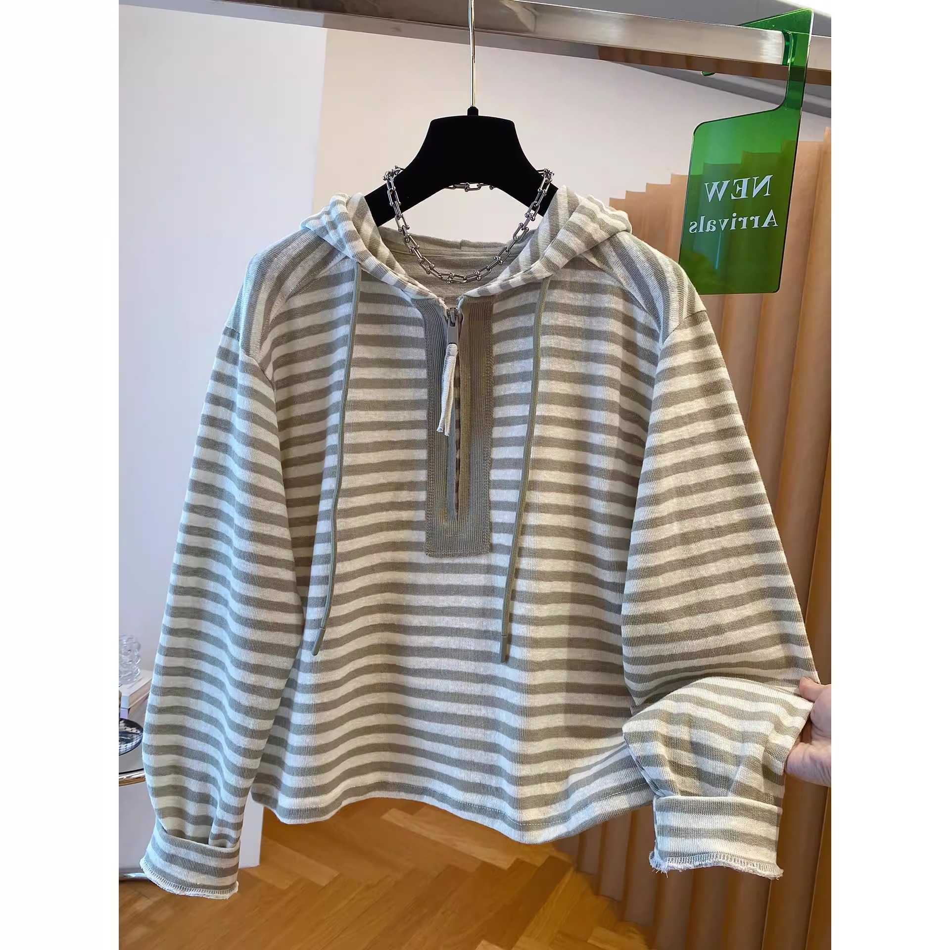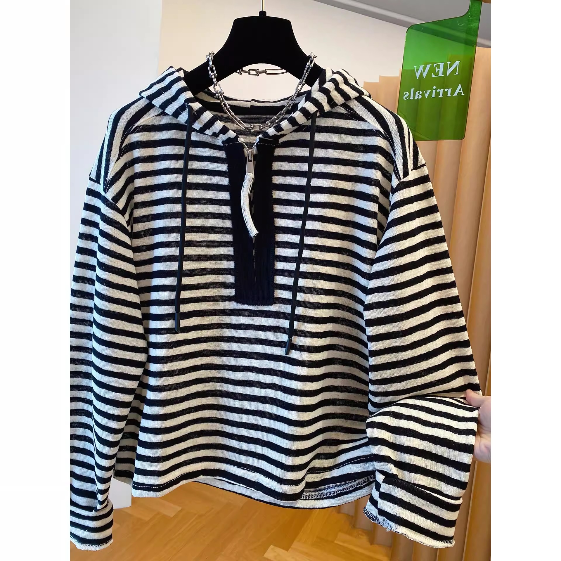 广州十三行高端爆款~连帽半拉链条纹t恤女长袖宽松休闲卫衣上衣秋