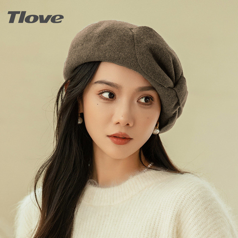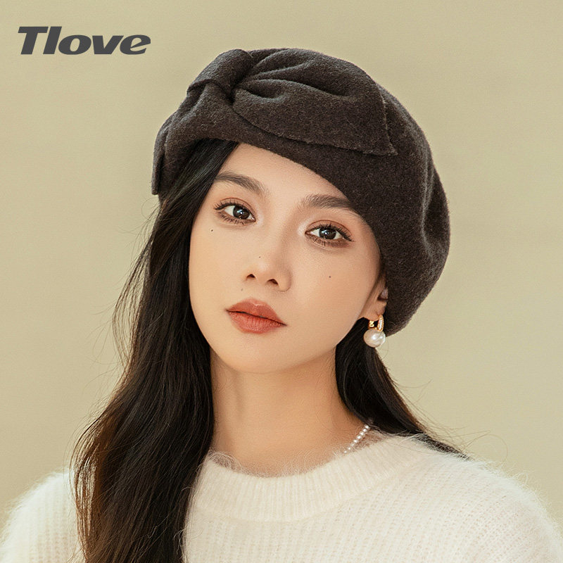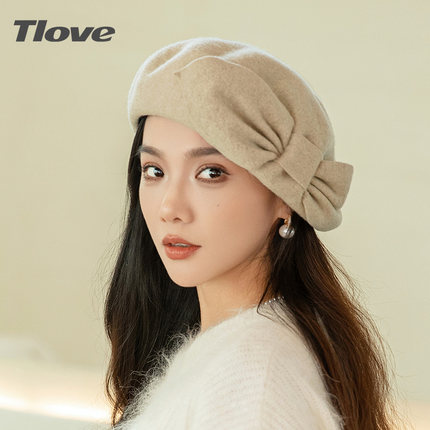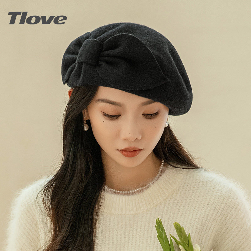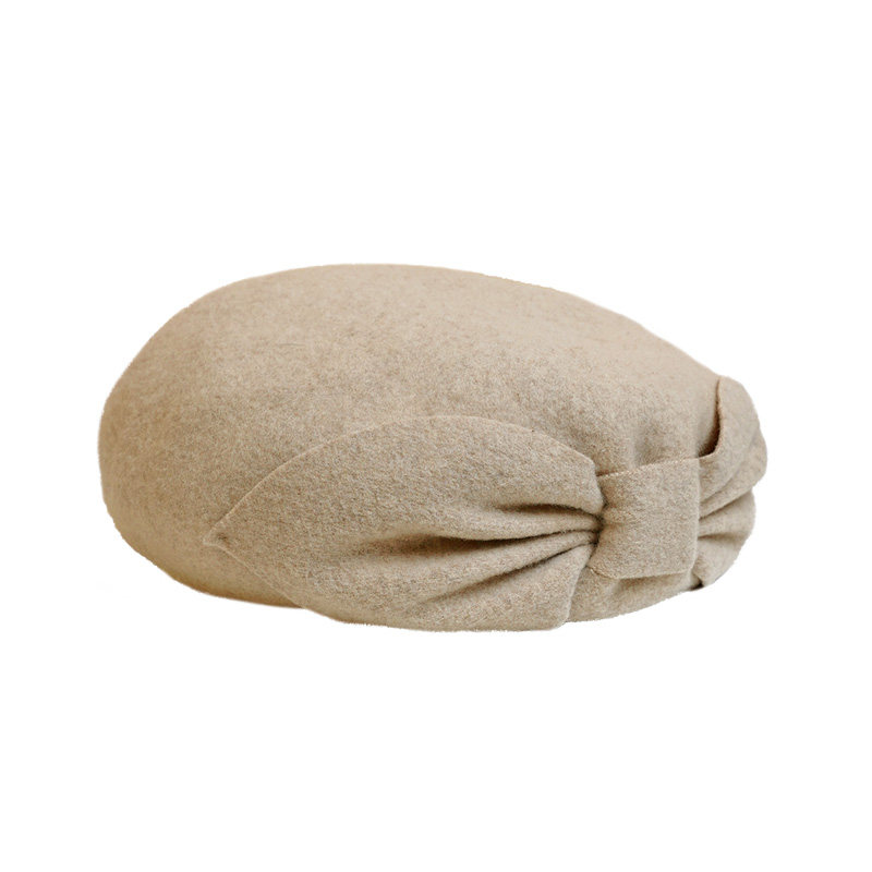9436秋冬季新品羊毛贝雷帽女士时尚优雅蝴蝶结舒适保暖出街蓓蕾帽