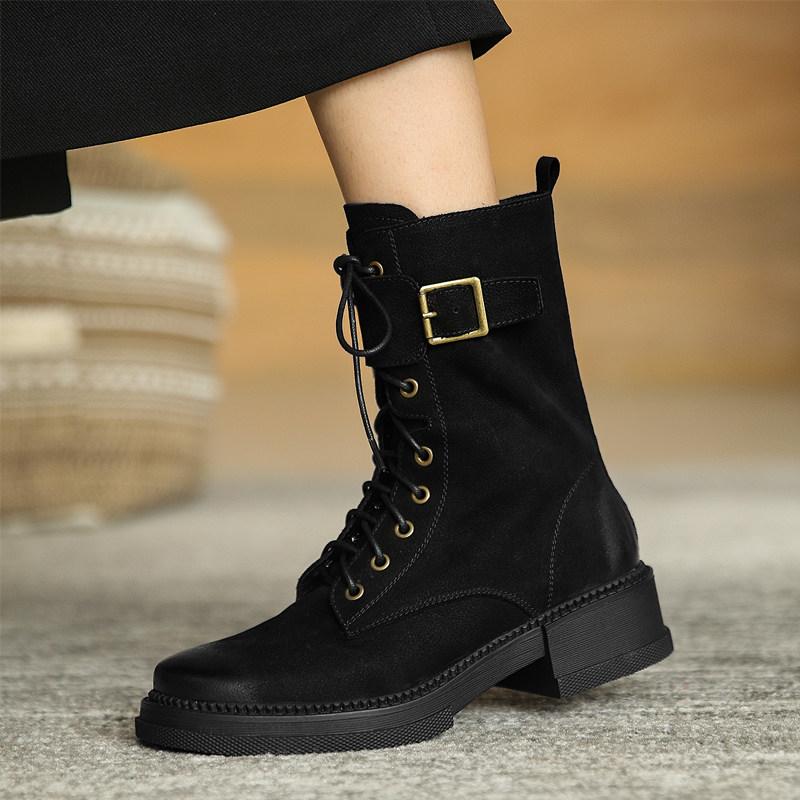 复古皮靴女黑色圆头短靴系带中跟及踝靴马丁靴2025新款皮带扣女靴
