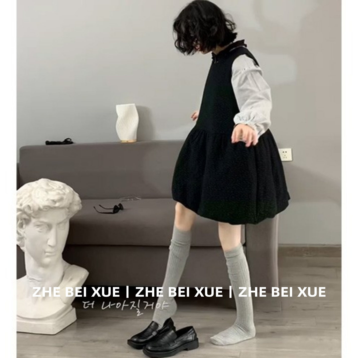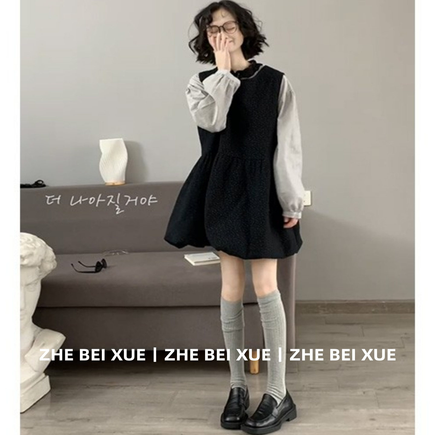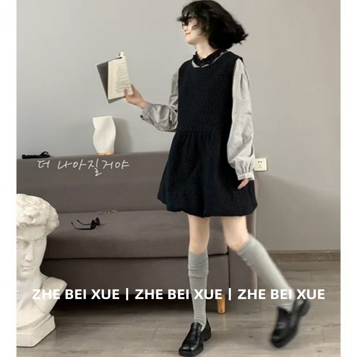 套装女韩系条纹长袖衬衫叠穿花苞背心连衣裙子巨好看的冬装一整套