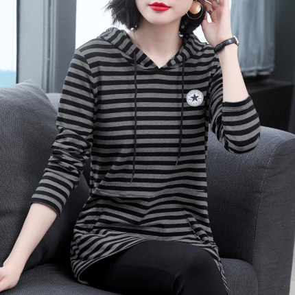 连帽条纹卫衣女装春秋新款洋气妈妈长袖t恤大码中长款上衣打底衫