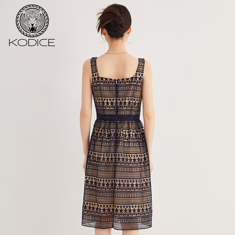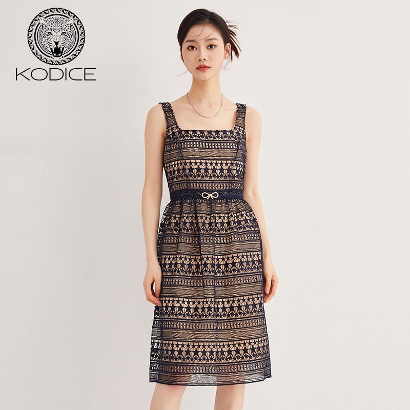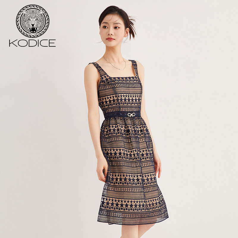 KODICE方领吊带裙连衣裙女装夏季新款镂空蝴蝶结收腰度假风长裙子